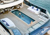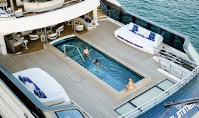 The expansive sundeck includes a Jacuzzi surrounded by sun loungers, a fully equipped gym, a bar, and plenty of room for large parties. The main deck features a massive swimming pool with an integrated Jacuzzi and oversized sun loungers protected by privacy glass.