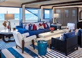 A spacious main salon with panoramic windows, plush seating areas, exquisite artwork, and state-of-the-art entertainment systems provides the perfect setting for relaxation and socializing. The movie room, overlooking the bow, turns into an intimate theater when the curtains are drawn, with a massive screen coming down from the ceiling. Guests can relax and indulge on the comfortable built-in sofa. The upper deck saloon’s main focal points are a bar, grand piano, and seating area. These create a central guest space adjacent to the informal exterior dining space, fire pit, and Teppanyaki bar.