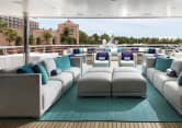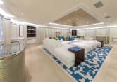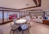 The 200 Ft. (61m) superyacht JUST J’S features a carefully considered balance of indoor and outdoor spaces. One of the striking features is the positioning of the four guest suites and VIP stateroom on the main deck, ensuring that guests have superb views. The main deck is home to a large dining room and lounge, with the owners’ accommodation housed on a dedicated private deck above. This extra deck comprises the master stateroom forward with large skylight, two bathrooms, a master study and a bar with sky lounge.