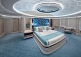 Above is the bridge deck with wheelhouse and a range of facilities for the captain, with the rest of the crew also being very well catered for on the lower deck. In addition to seven crew cabins forward, there are two additional guest cabins on the lower deck. The lower deck also features a gym in the spacious lazarette. A large tender and four jetski’s will be launched from both port and starboard. Add in the sun deck with a 3 x 2 meter swimming pool and this is clearly a magnificent superyacht in every sense.