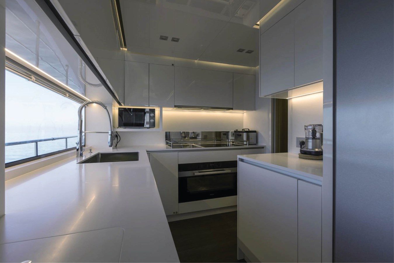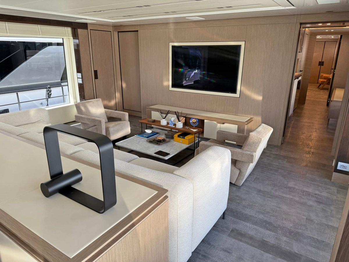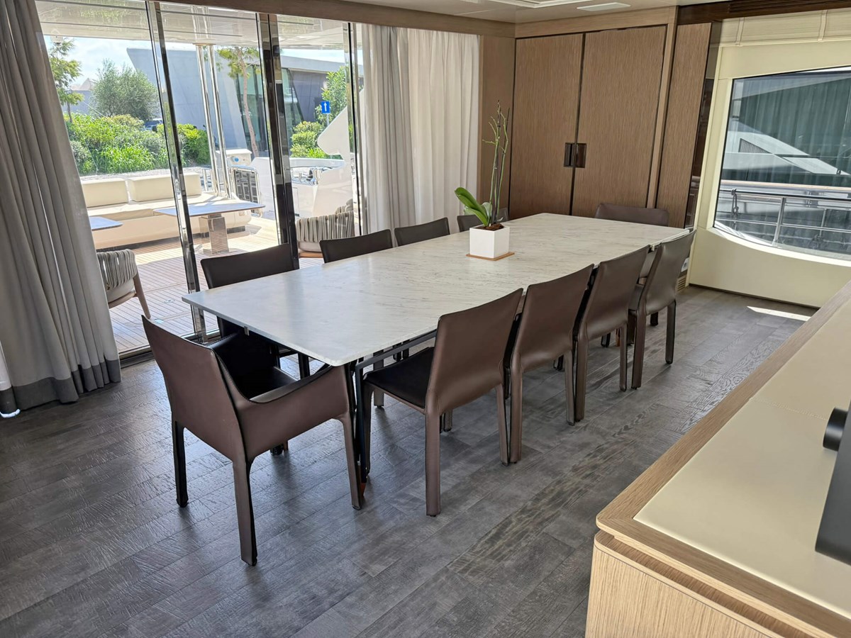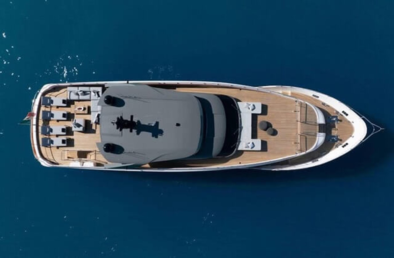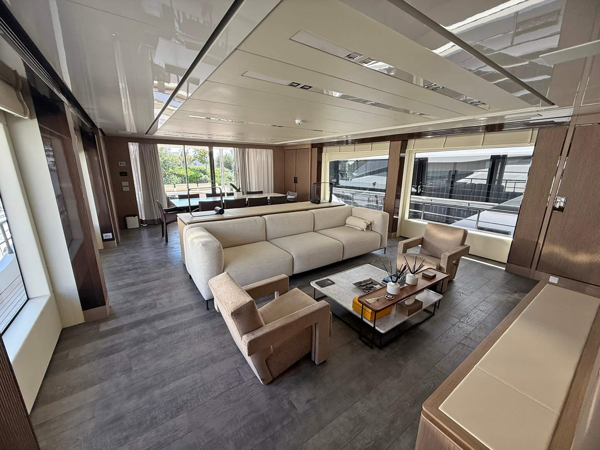 The yacht’s technical excellence is underscored by its powerful propulsion system, driven by twin MAN V12-2000 engines, each delivering 2000hp, paired with ZF V-drive gearboxes. This configuration allows for a maximum speed of 22 knots and a cruising speed of 19 knots. Onboard systems are powered by two KOHLER generators, each with a capacity of 45 kW, ensuring smooth operation of all essential equipment..