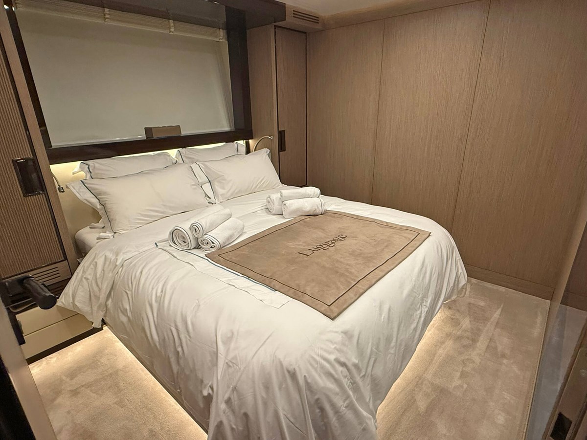 With a sleek walkaround design, this yacht boasts full ceiling-to-floor windows, flooding the interior with natural light while offering stunning panoramic sea views. Accommodating up to 10 guests in 5 opulent cabins and 5 bathrooms, plus 3 crew cabins for up to 5 crew members, the layout ensures both comfort and privacy. The master cabin is conveniently located on the main deck, while 2 VIP cabins and 2 guest cabins are found on the lower deck, providing a spacious and versatile sleeping arrangement for guests.