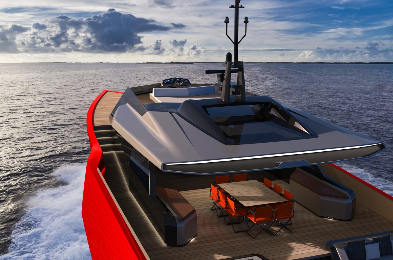 The yacht’s exterior is crafted to perfection with clean lines and a sleek design, built to stand out in any marina or bay, anywhere in the world. Every curve and corner of the yacht communicates the audacious spirit of Tribale Yachts, reflecting the quality, innovation and the vivid grandeur that the brand is known for.
