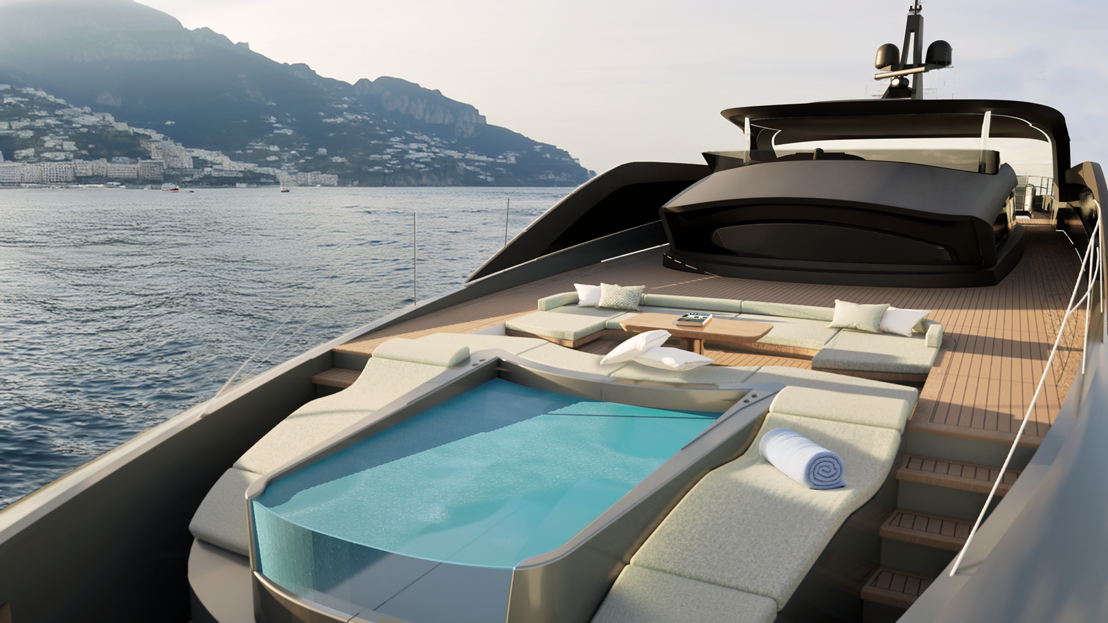 a sea-level beach club ideal for lounging, swimming, or launching tenders. The
