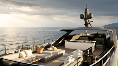 flybridge offers panoramic views, a bar, sun loungers, and a shaded dining area