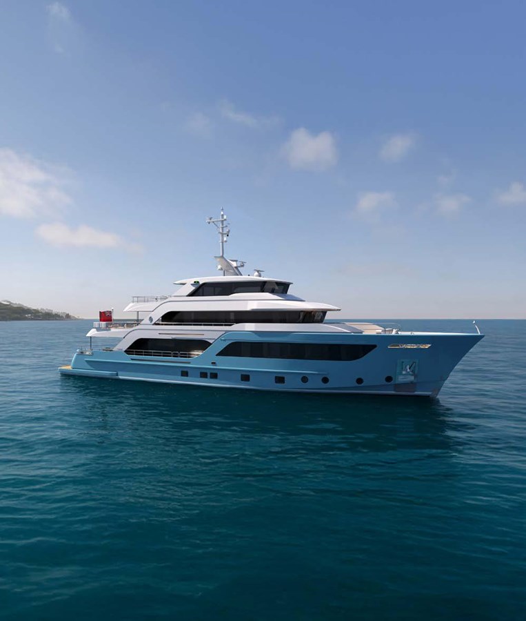 Measuring 39.42 meters in length (130 ft) with a beam of 8 meters (26’2”) and a Bahamas and Caribbean friendly draft of 2.4m (7’8”), Acciaio 130 has a displacement of approximately 388 tons and she is built for