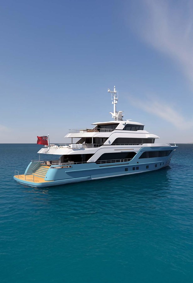 The yacht’s exterior design is characterized by an imposing flared bow, engineered to handle high seas, with a sheer line that flows seamlessly fore to aft, creating a sophisticated yachting silhouette.