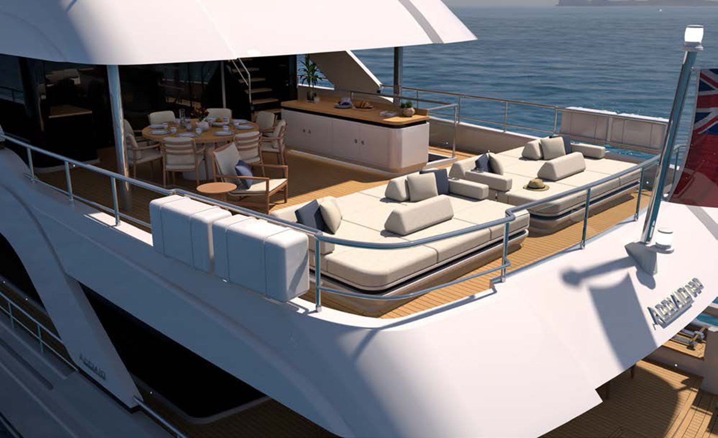 This elegant curvature is echoed in the fashion plates, which cascade smoothly from the top of the superstructure down to the main, upper, and sun decks, framing the yacht’s signature windows.