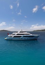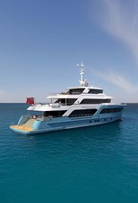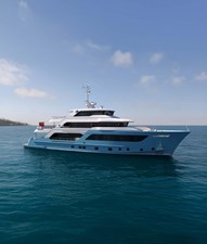 efficiency. Its hull design, featuring a bulbous bow, ensures reduced fuel consumption while delivering an impressive cruising range. Powered by two MAN engines delivering 749 kW each, the yacht reaches a