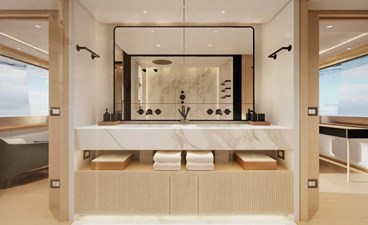 The stern area also presents a unique concept: a full-beam staircase provides seamless access from the main deck cockpit to the swimming platform, creating a multi-level social area that is perfect for use at anchor. This inviting beach club atmosphere is further enhanced by a Finnish sauna located in the lazarette below.