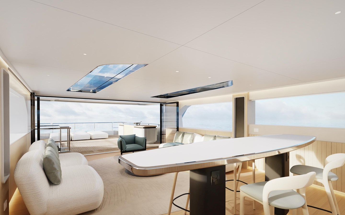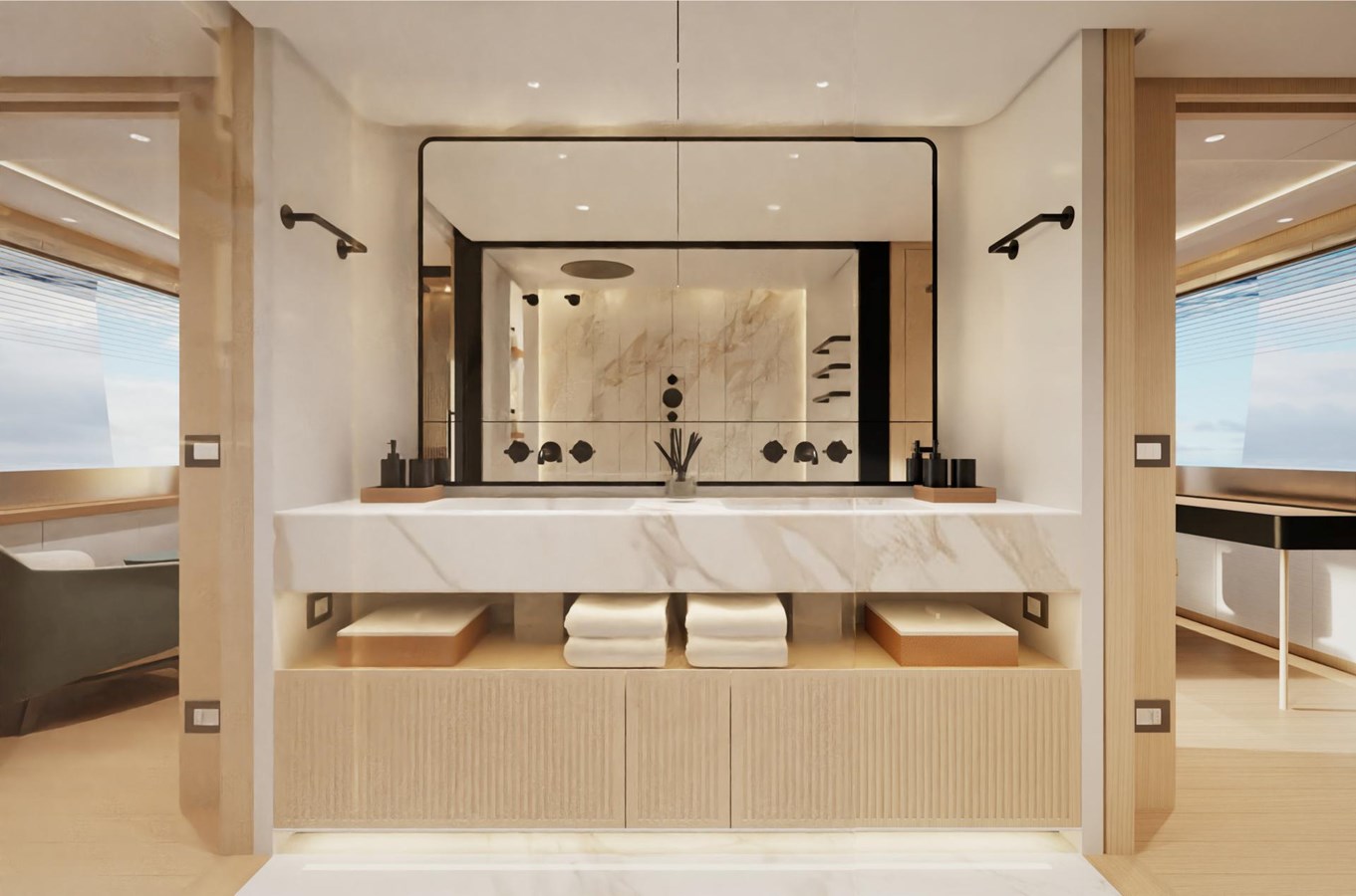 Designed specifically by her current Owner for a round the world trip, the yacht boasts a 5,000 nm range at 10 knots, powerful zero-speed stabilisers for comfort underway or at anchor, and plenty of storage. There are generous deck areas for relaxing or dining alfresco, including windbreak doors on the sides of the bridge deck which will make outdoor dining in windier parts of the world possible. The enclosed sundeck forward provides huge flexibility in all weathers, and is a space with loose furniture that could easily be re-purposed into a gym or dining area. It also features a large bar and grill area, ideal for entertaining. The doors here pin back flush with the bulwarks for use as one large inside-outside space. The yacht also has a beach club area with sauna, and an enormous swim platform with a built-in shower and Opacmare transformer stairs for easy access to the sea or for use as a second passerelle in port. Removable railings on the swim platform and stairs up the huge aft deck allow the entire area to be used as a triplex beach and watersports area when at anchor, and there is plenty of storage in the beach club and engine room for water toys, bikes etc.