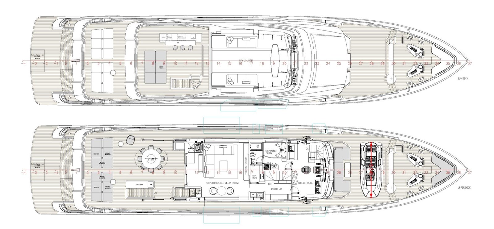Her Hydro Tec exterior lines give her a purposeful yet elegant profile, while interiors by the Italian design studio of Giorgio Cassetta bring a fresh, contemporary feel with bright, welcoming guest spaces and a neutral colour palette which can easily be added to by a new owner. Accommodation is for up to twelve guests across five cabins, with each twin cabin able to become a double, and pullman bunks in each cabin. This gives tremendous flexibility, with almost any combination of guests able to be accomodated. There is also accomodation for up to 8 crew in spacious crew quarters which have been fitted out to guest standard and provide very pleasant crew accomodation. A Captain's double cabin is next to the Bridge on the upper deck.