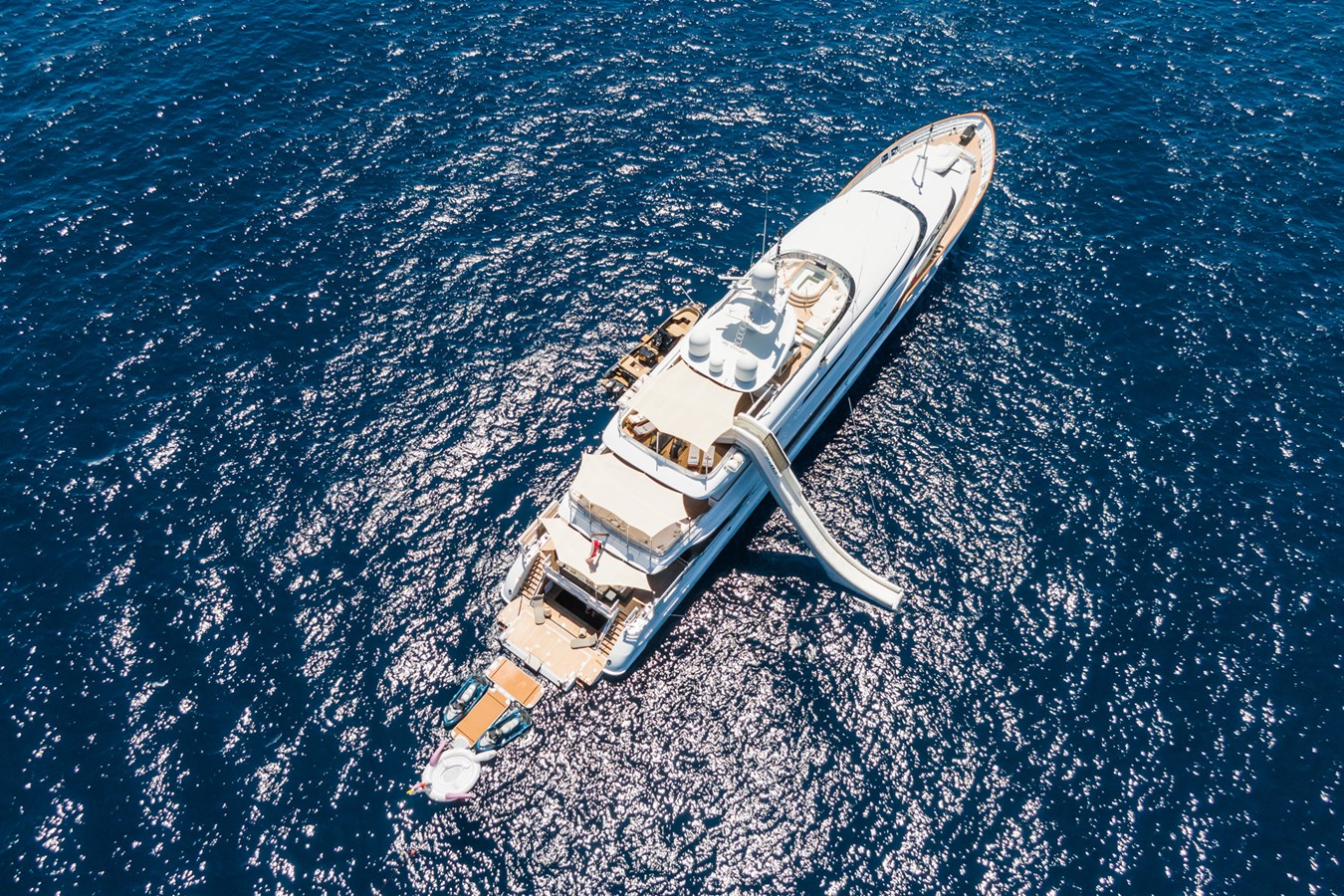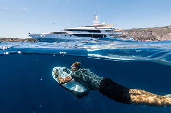 The interior is inspired by one of London’s finest boutique grand hotels in Knightsbridge, The Wellesley. She’s got a timeless and luxurious art deco style that transmits sophistication and comfort. Her accommodation sleeps 12 and consists of two master suites, one on the lower deck and one of the upper deck, a main deck VIP, 2 sets of twin rooms and a double cabin.