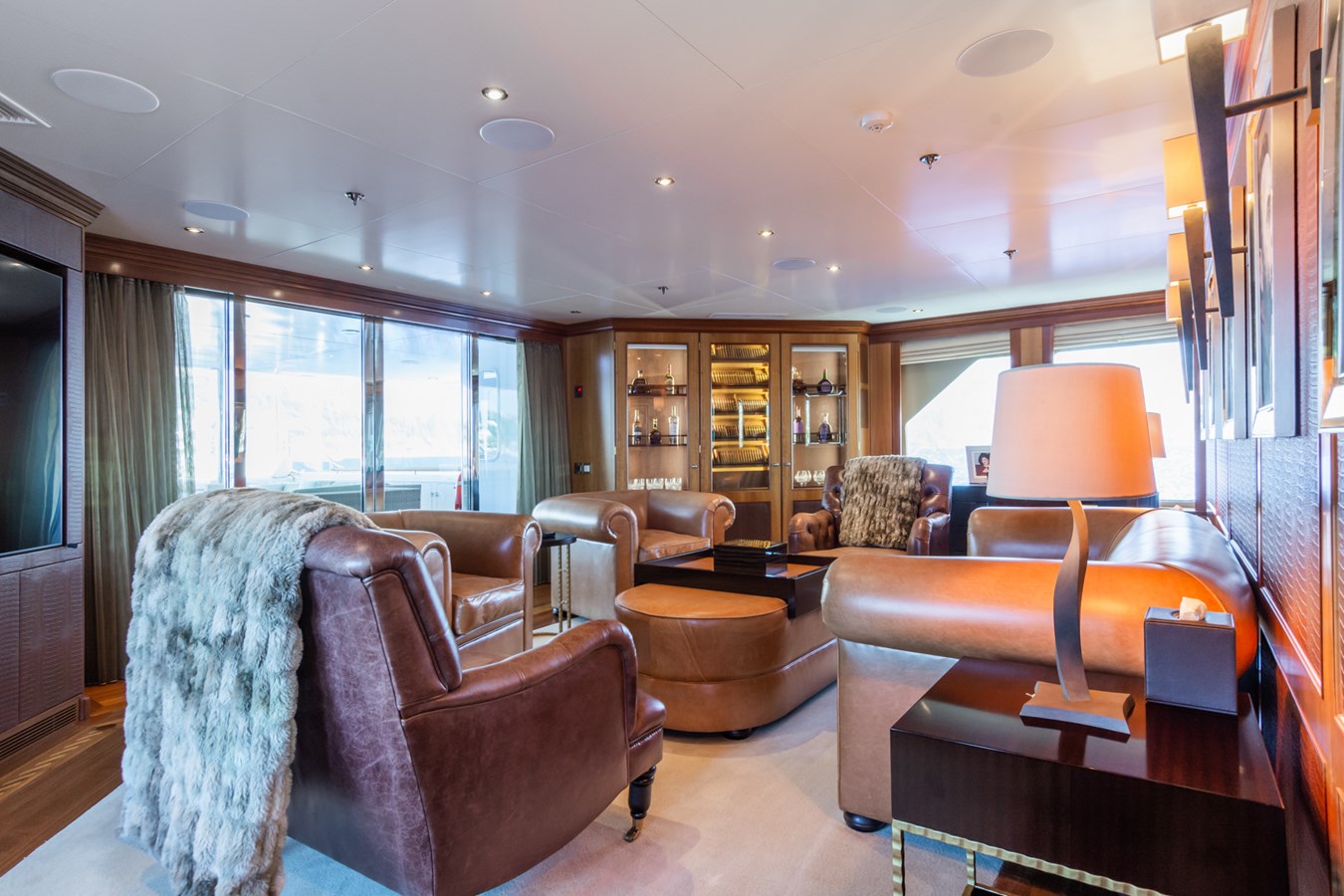 On the upper deck you will find one of the yacht’s standout features - the Cigar Club Lounge - outfitted in rich leathers and woodwork.