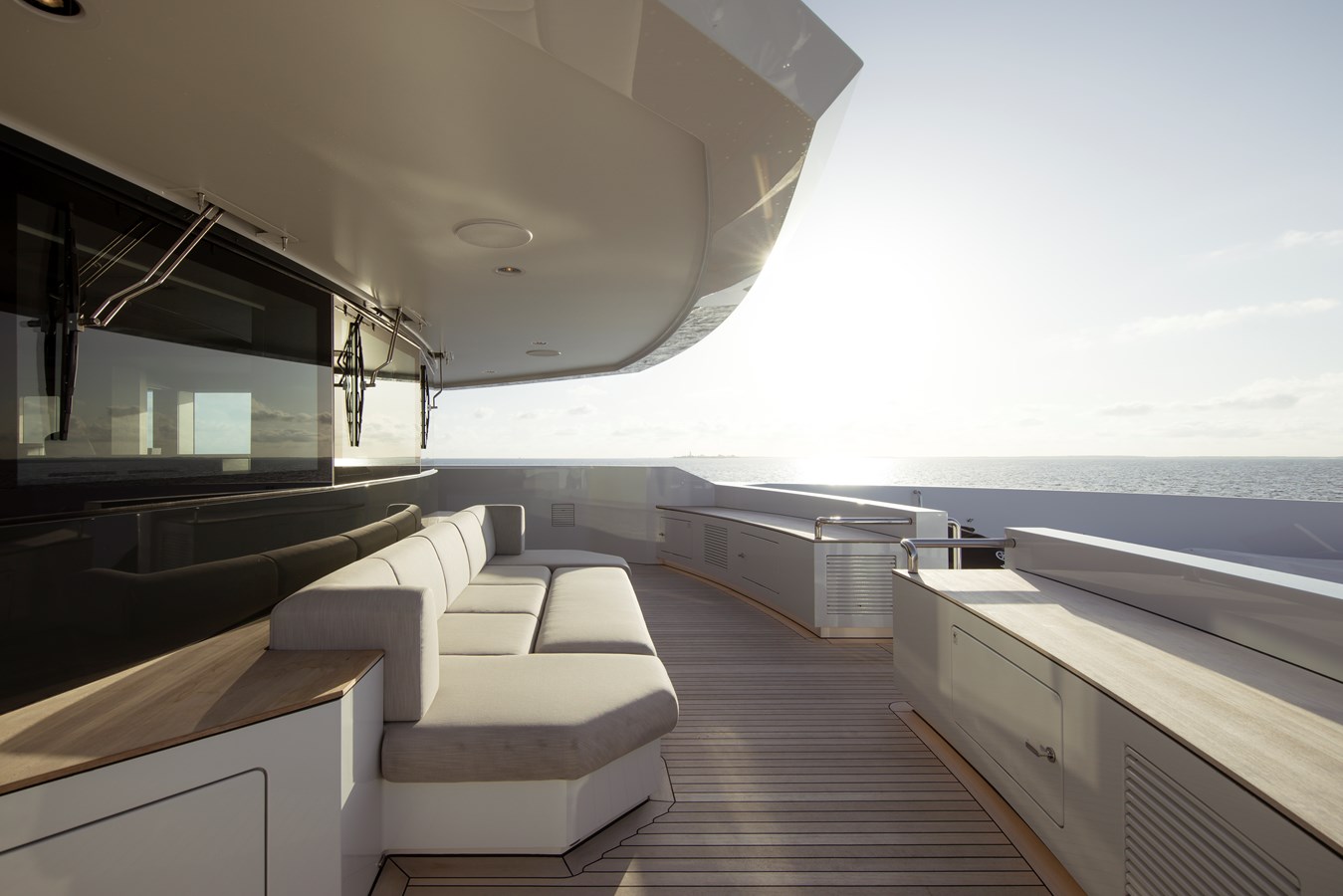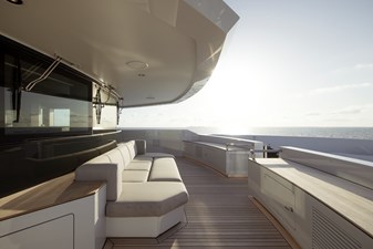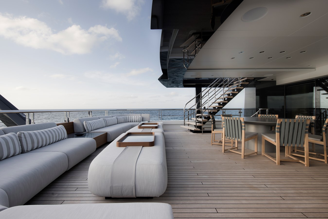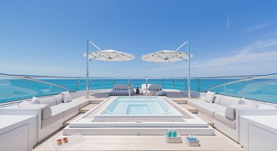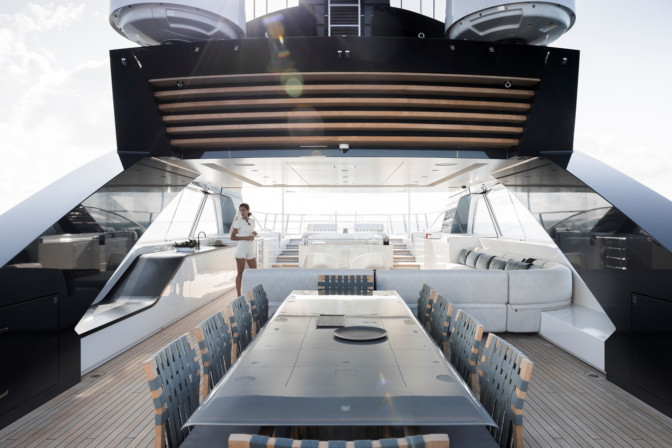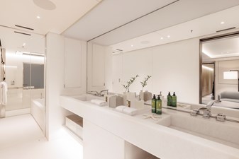The master suite boasts a his-and-hers bathroom and expansive dressing room. Standout guest areas include an extended sundeck with integrated bar, multiple al fresco dining and lounging zones, and a large Jacuzzi forward on the sundeck.