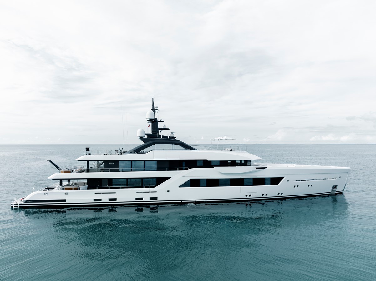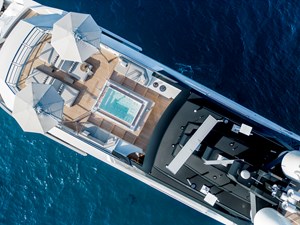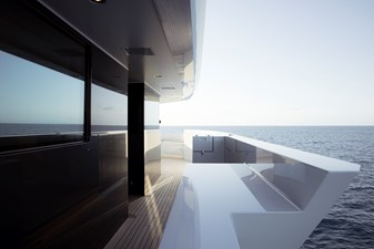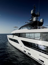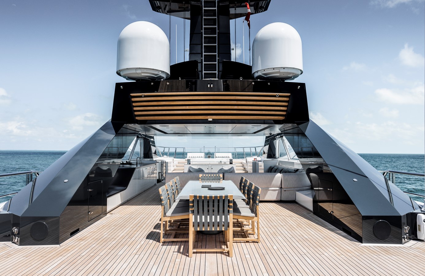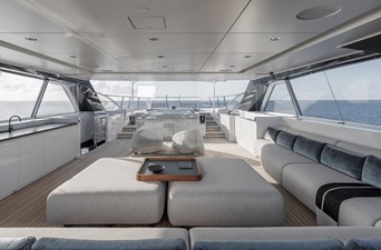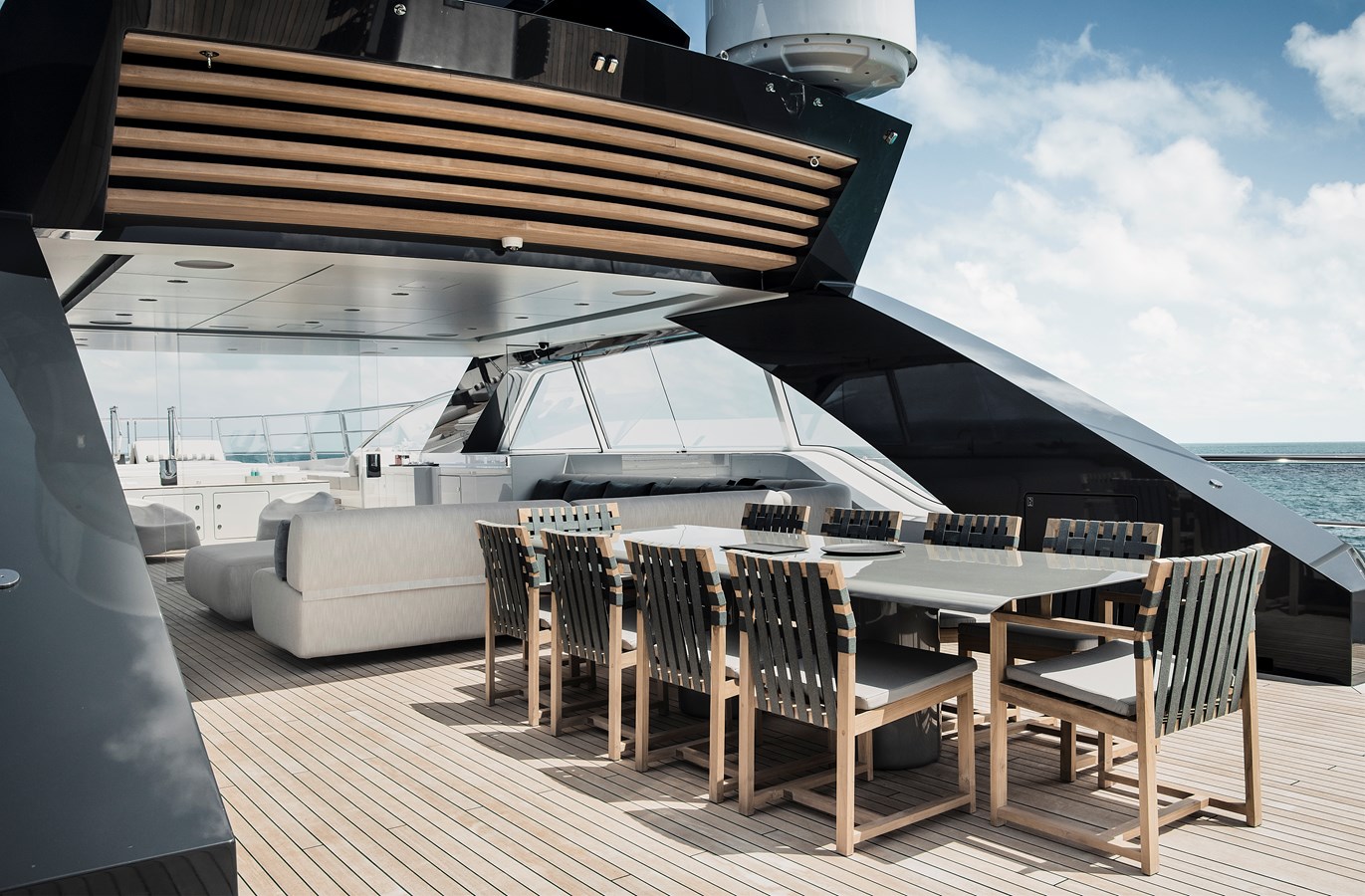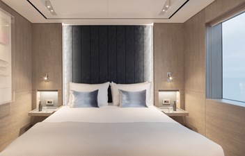 The master suite boasts a his-and-hers bathroom and expansive dressing room. Standout guest areas include an extended sundeck with integrated bar, multiple al fresco dining and lounging zones, and a large Jacuzzi forward on the sundeck.