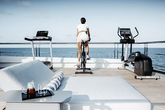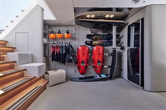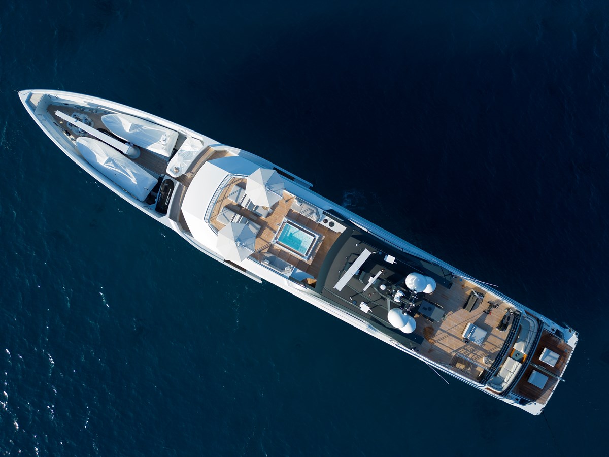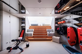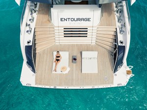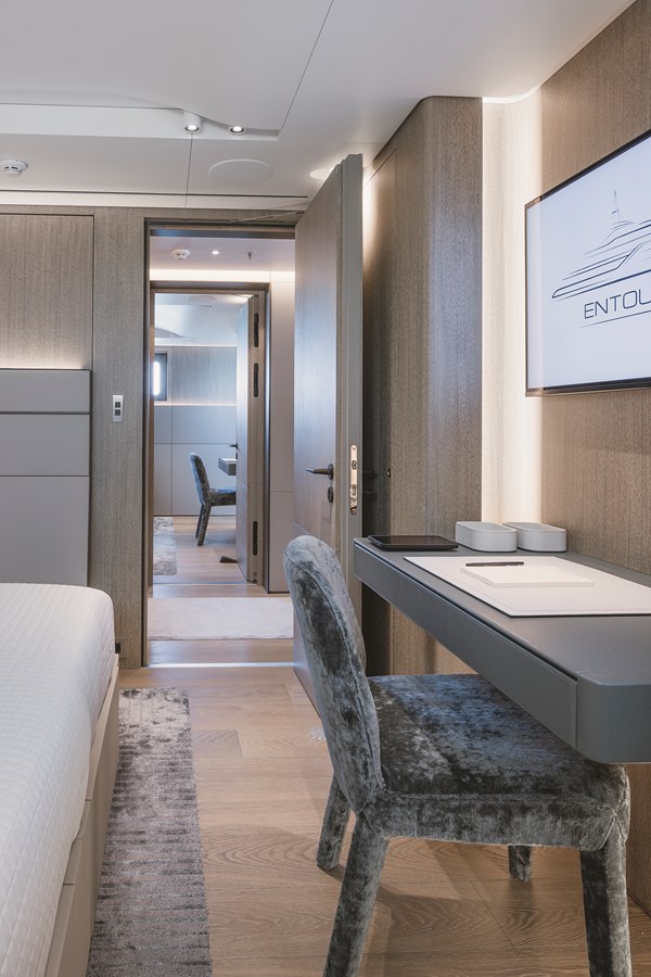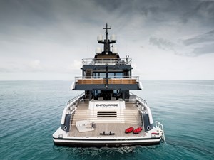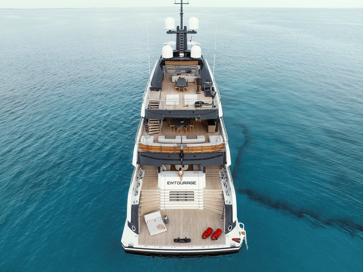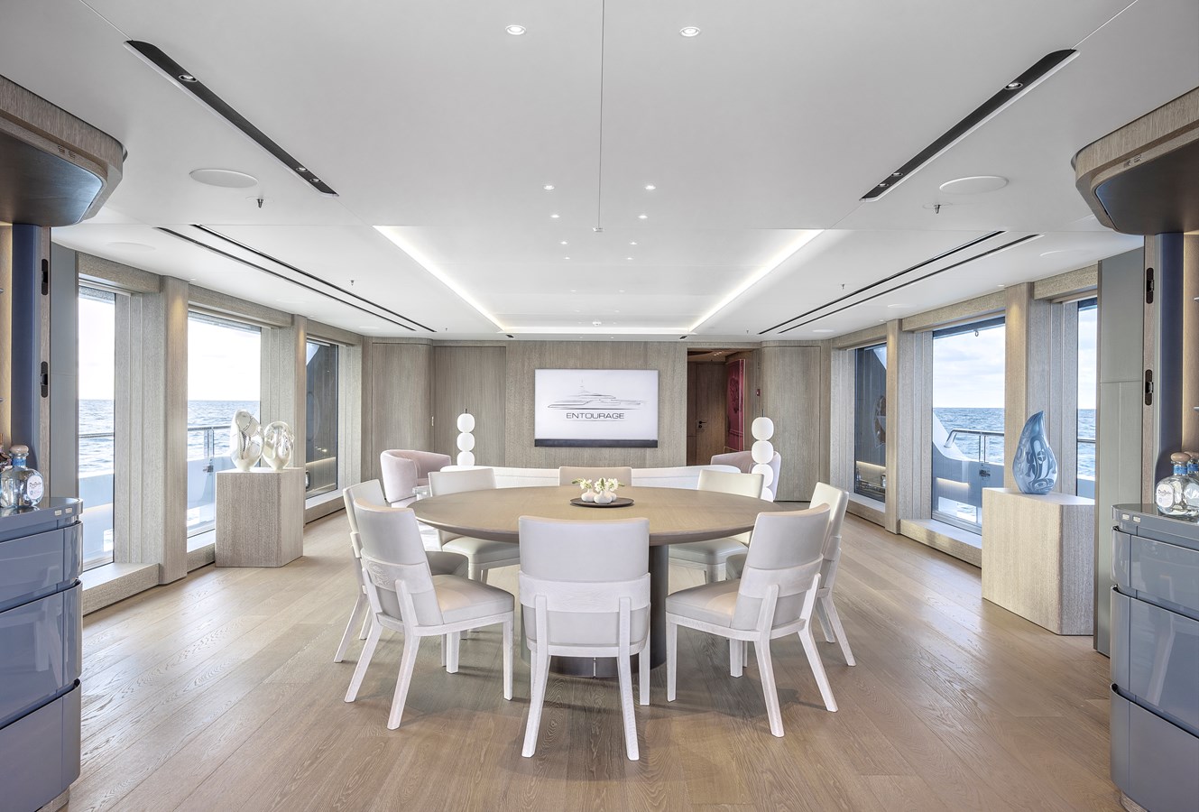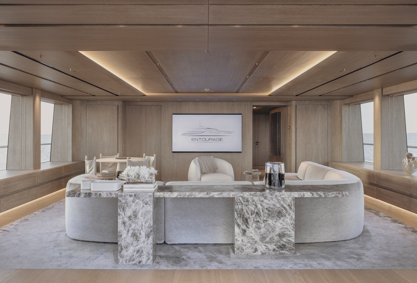 Wellness is seamlessly incorporated. The spacious beach club connects directly to the swim platform, offering lounging areas with stunning sea views and easy water access. A gym supports fitness routines, complemented by an array of water-based activities, while entertainment options include satellite TV, Wi-Fi, and provisions for outdoor screens. Powered by twin MTU engines with IMO Tier III-compliant hybrid technology, ENTOURAGE achieves a range of 4,500nm at 13 knots, enhanced by stabilizers for smooth comfort at anchor and underway. A comprehensive selection of tenders and water toys rounds out the offering, making her perfect for worldwide exploration, lively gatherings, or tranquil getaways.