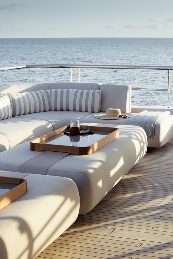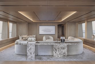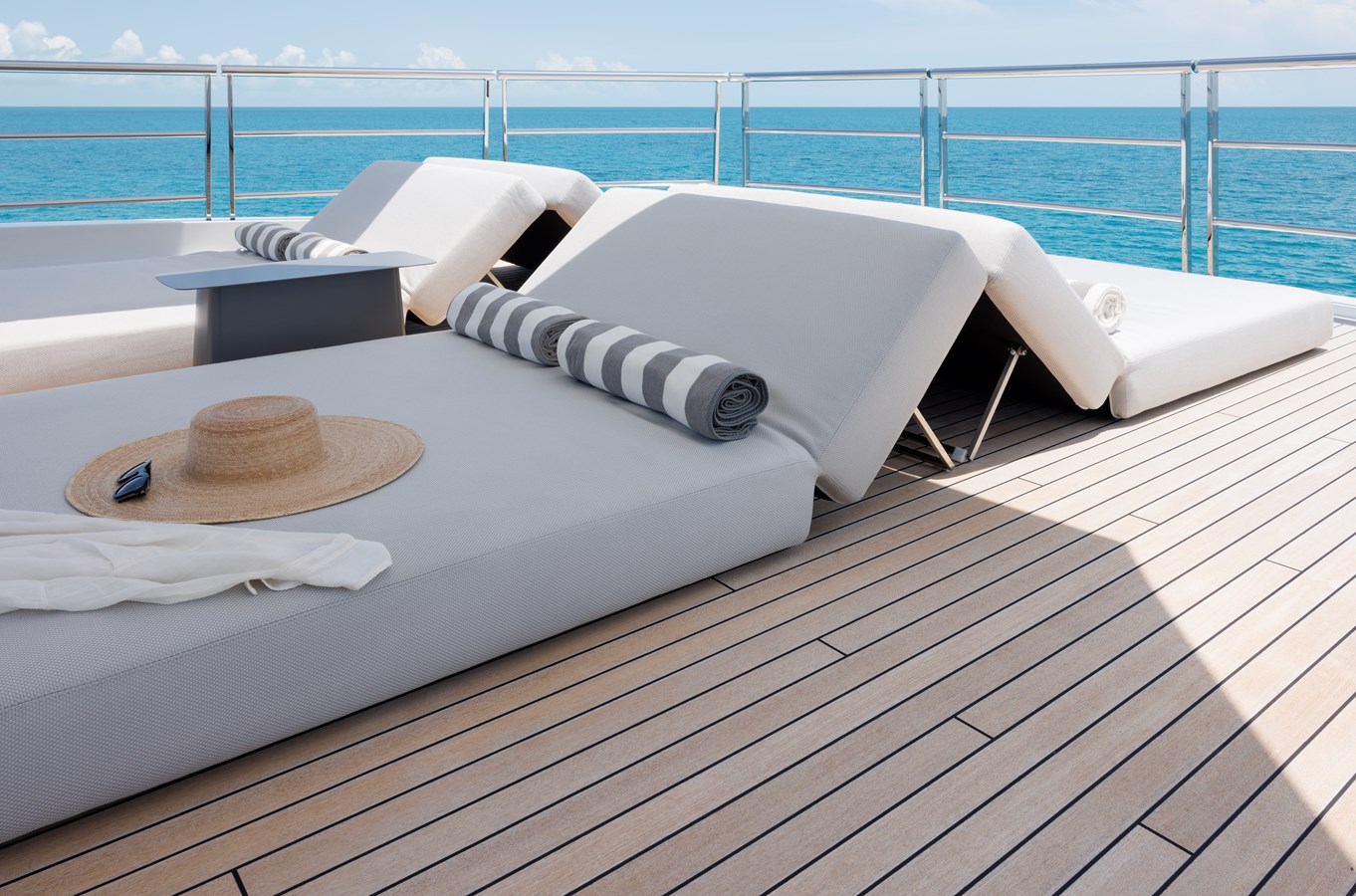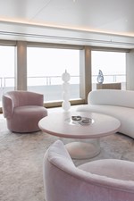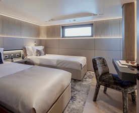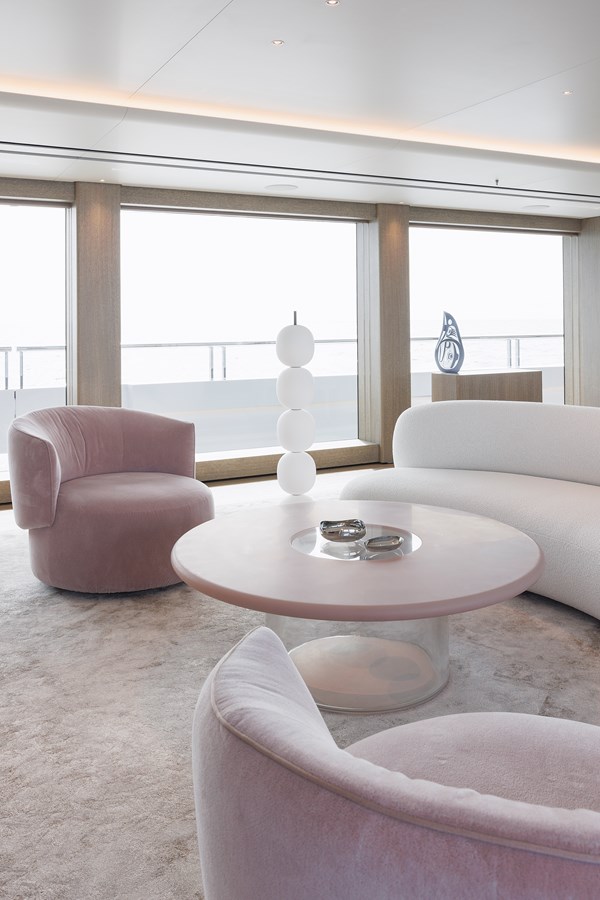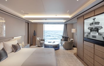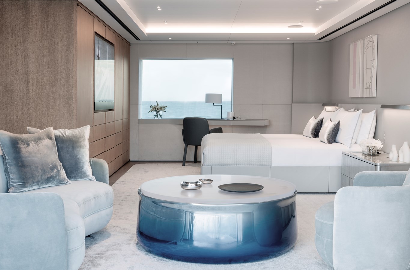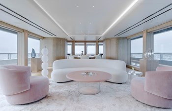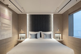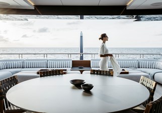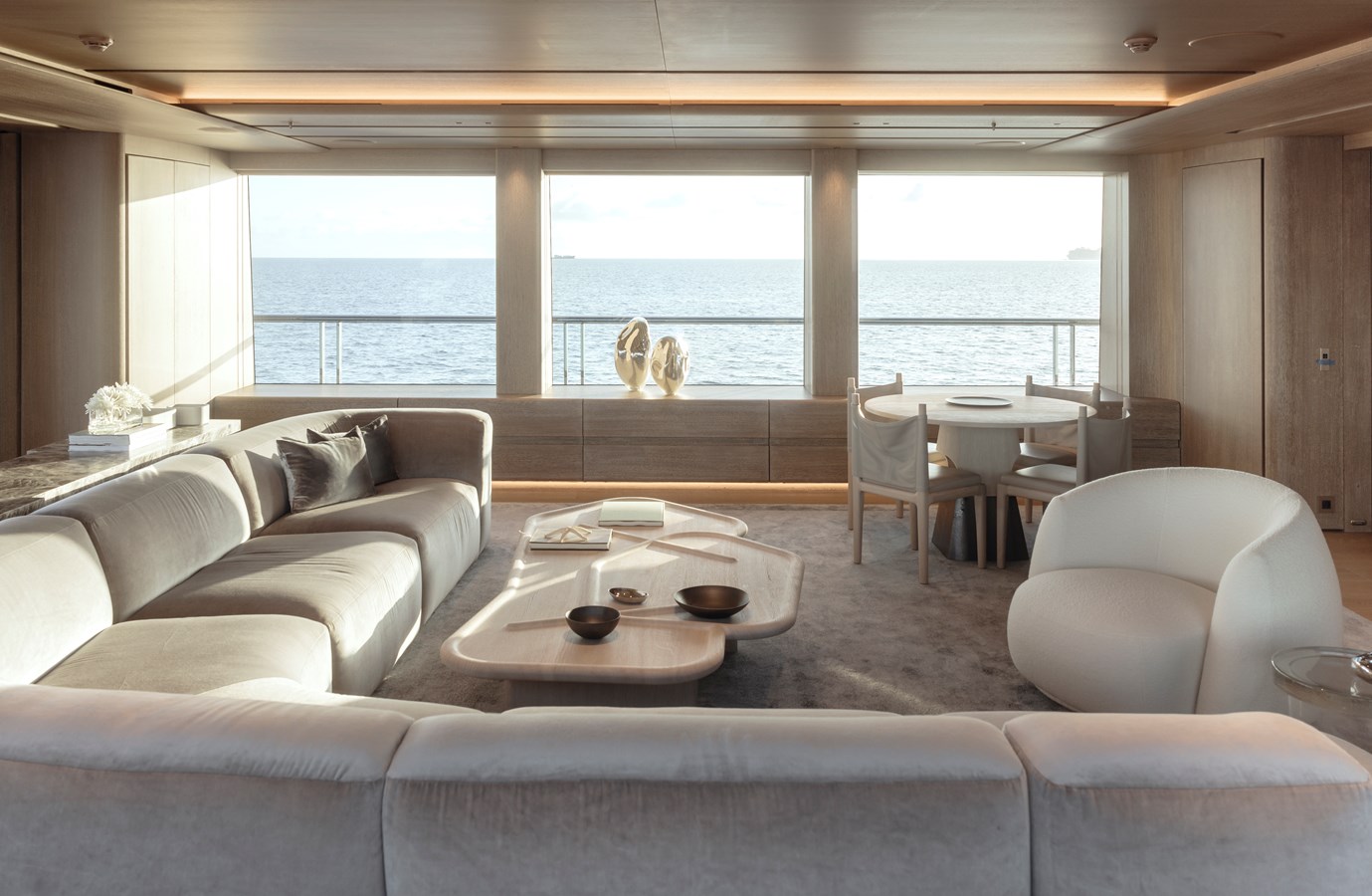 Her interiors emphasize serenity and natural light, with full-height windows flooding the spacious living areas. Light-colored fabrics, soft textures, and warm wood tones create a welcoming atmosphere, while the layout strikes a perfect balance between private retreats and communal spaces. Ideal for extended voyages and leisurely onboard lifestyles, the yacht accommodates 12 guests in six cabins, featuring a full-beam master suite on the main deck and a dedicated VIP suite.