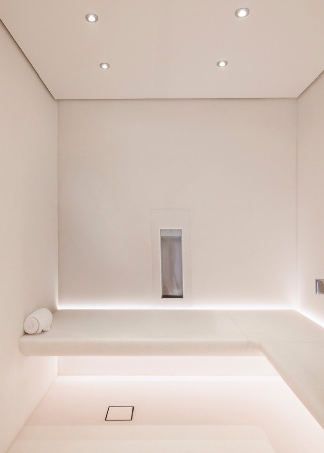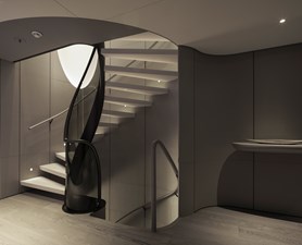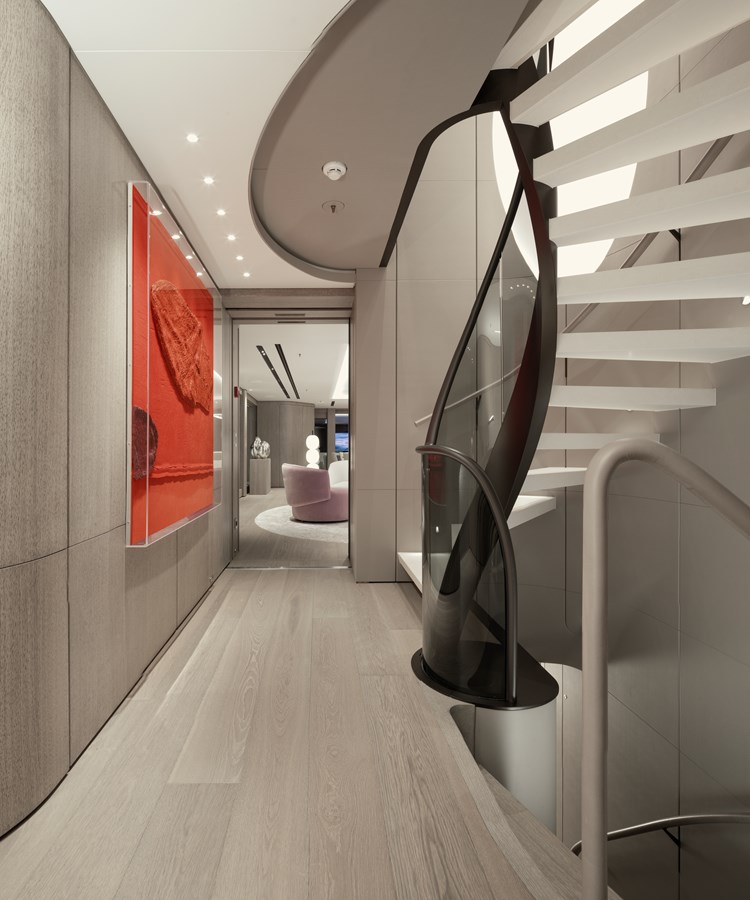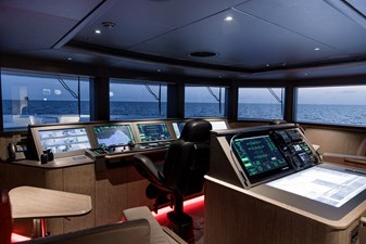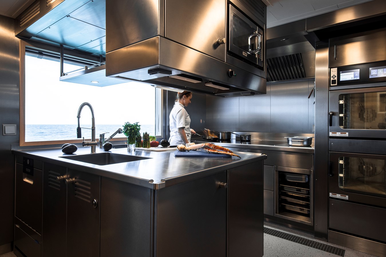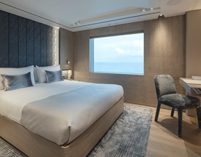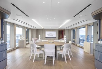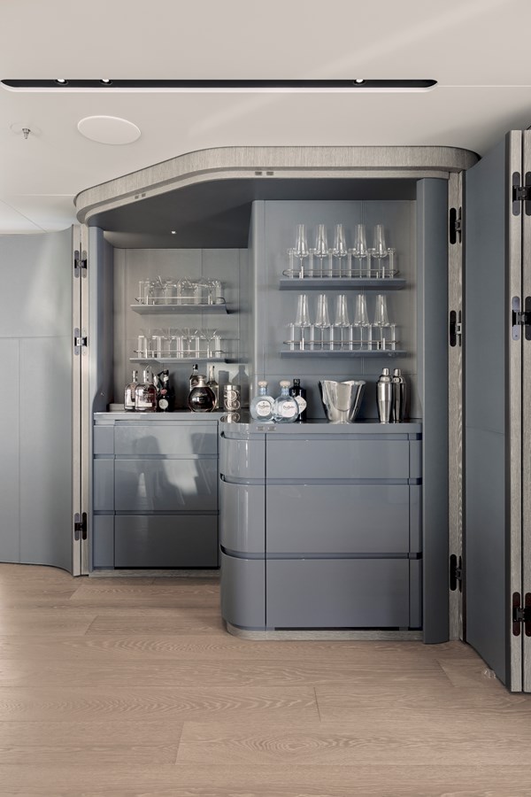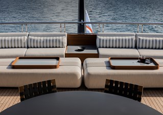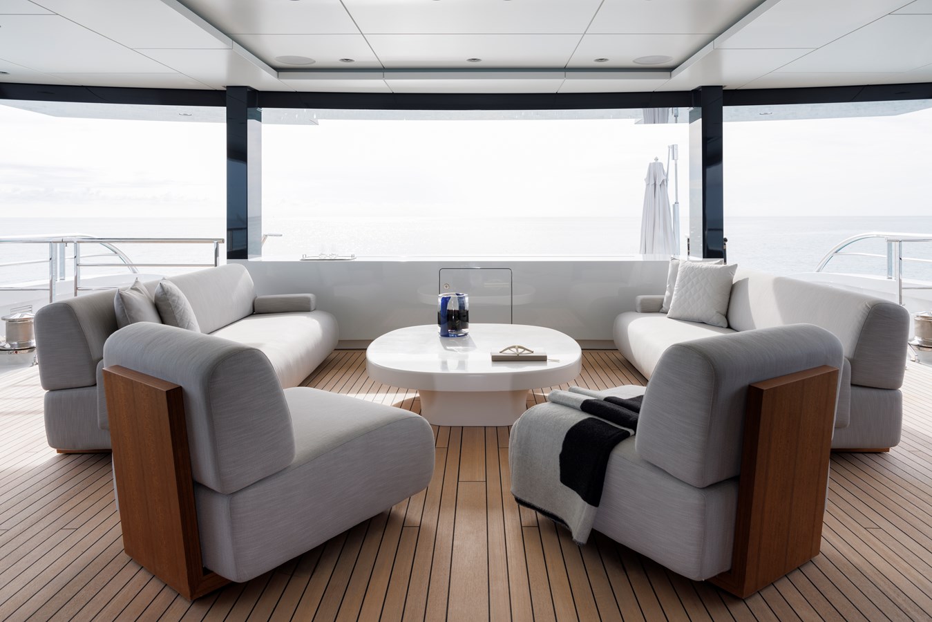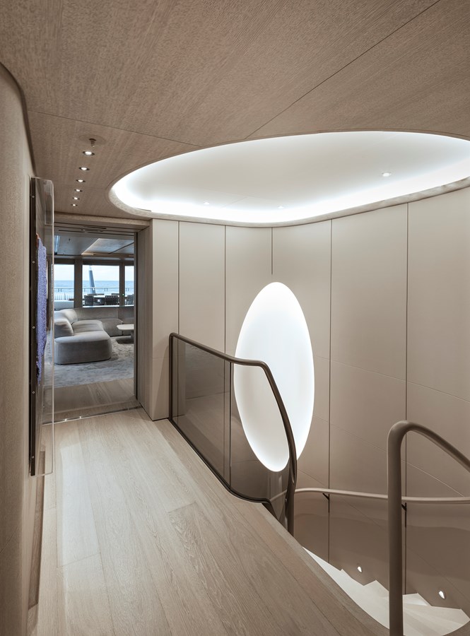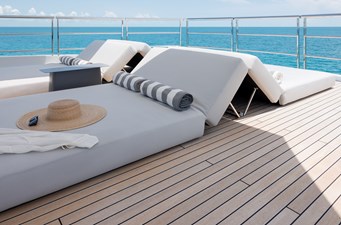 Her interiors emphasize serenity and natural light, with full-height windows flooding the spacious living areas. Light-colored fabrics, soft textures, and warm wood tones create a welcoming atmosphere, while the layout strikes a perfect balance between private retreats and communal spaces. Ideal for extended voyages and leisurely onboard lifestyles, the yacht accommodates 12 guests in six cabins, featuring a full-beam master suite on the main deck and a dedicated VIP suite.