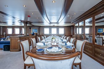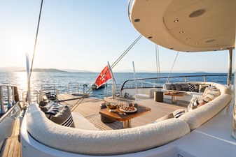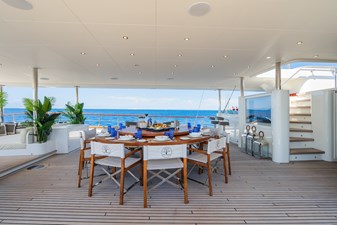 The sundeck features a central Jacuzzi, oversized sunpads, and multiple lounge and dining areas, alongside a fully equipped bar and grill. Alfresco dining is available on both the main and upper decks, each with elegant aft seating areas.