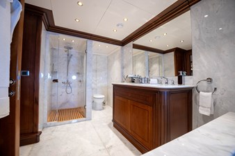 Forward on the lower deck lies a full-beam VIP stateroom, also fitted with a king-size bed, sofa, excellent storage, and en suite bathroom. Amidships are two additional double cabins, one with a queen bed to port, and the other with a king to starboard. Further forward are two versatile triple cabins, each with a queen bed and an additional single, ideal for families or children. A separate twin cabin is also located aft in the same private section as the master, perfect for nannies, security personnel or support staff, allowing flexibility without compromising discretion or comfort.