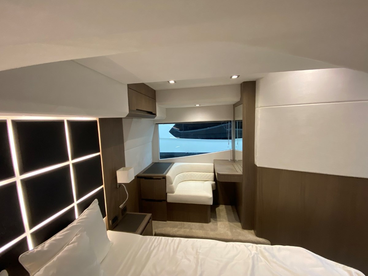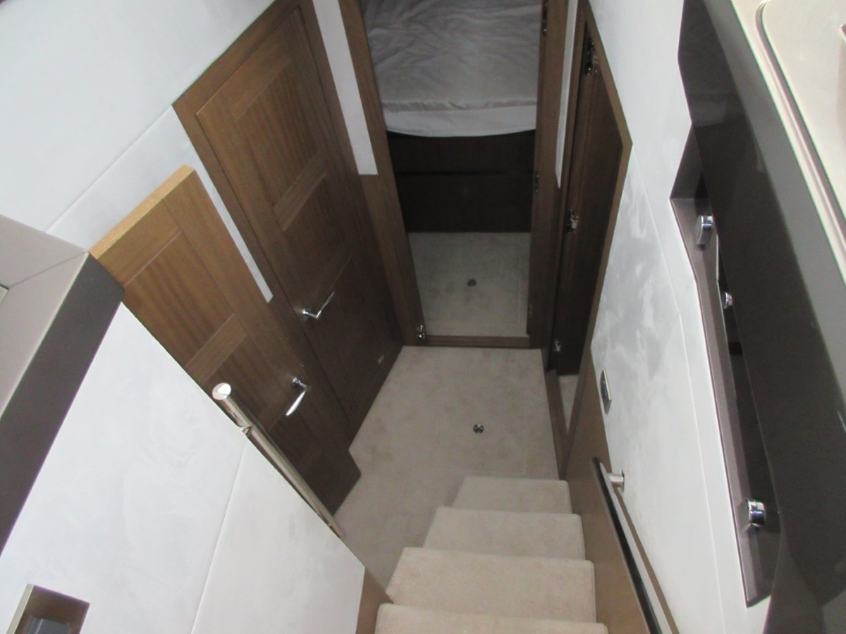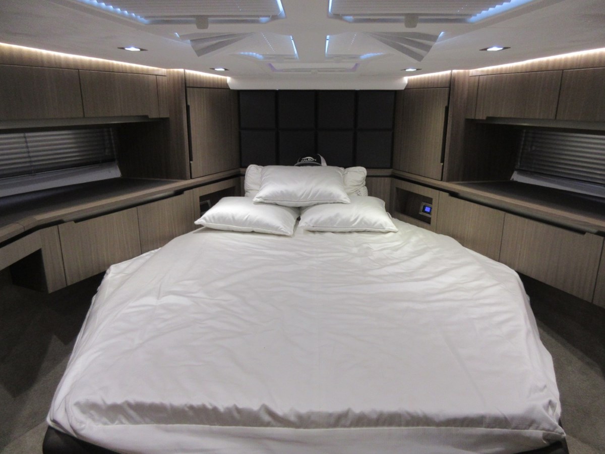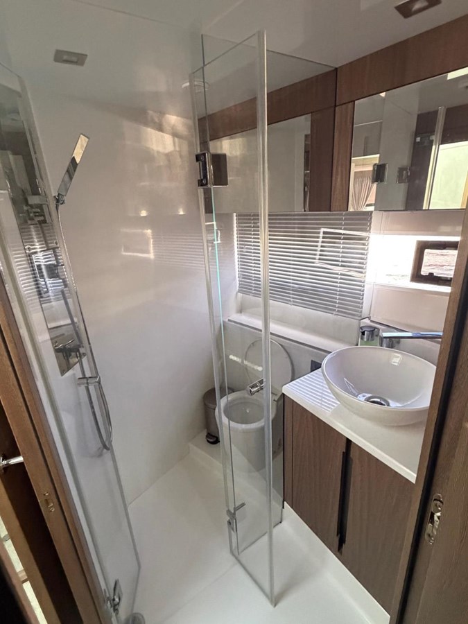 The main deck is fitted with a galley, dinette and plenty of storage areas to stow away items. The optional Beach Mode allows to drop down both sides and create a vast area near the cockpit, perfect for entertaining guests. Three different cockpit solutions are available, including the popular roto-seat option. Bow area can be fitted with an automatic settee for even more convenience outside. Down below three cabins and two bathrooms await the guests. The guest cabins offer a double in the bow area, and bunk beds starboard side. The owner’s cabin is located midship with an ensuite bathroom for extra privacy.
