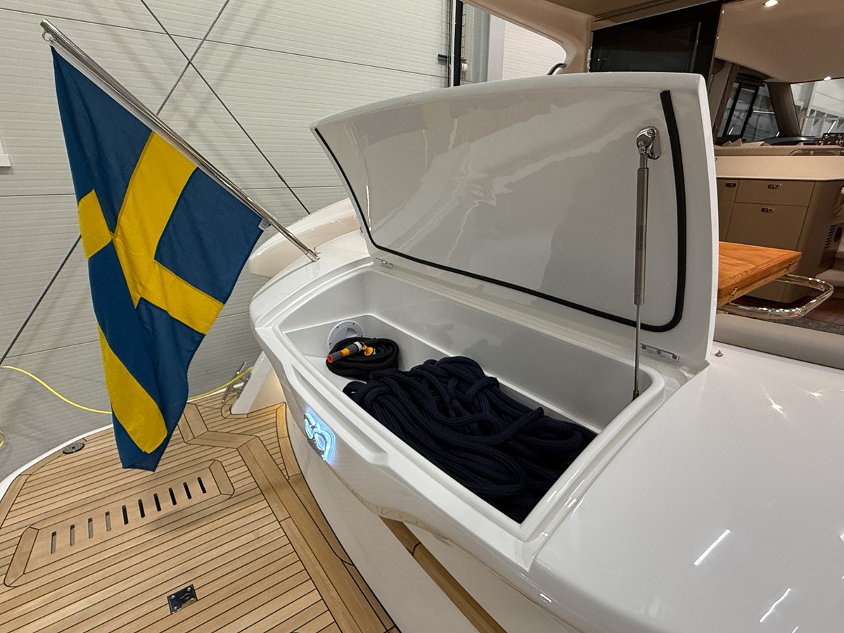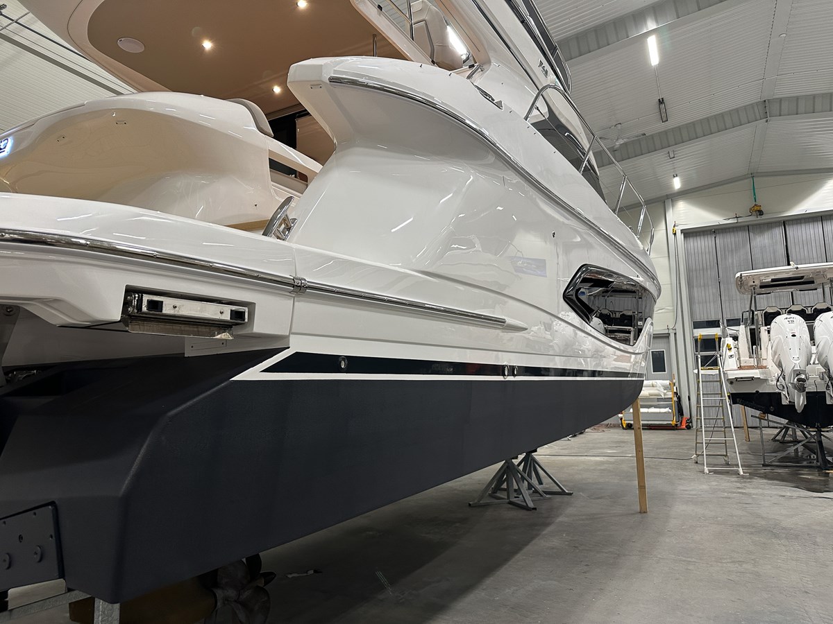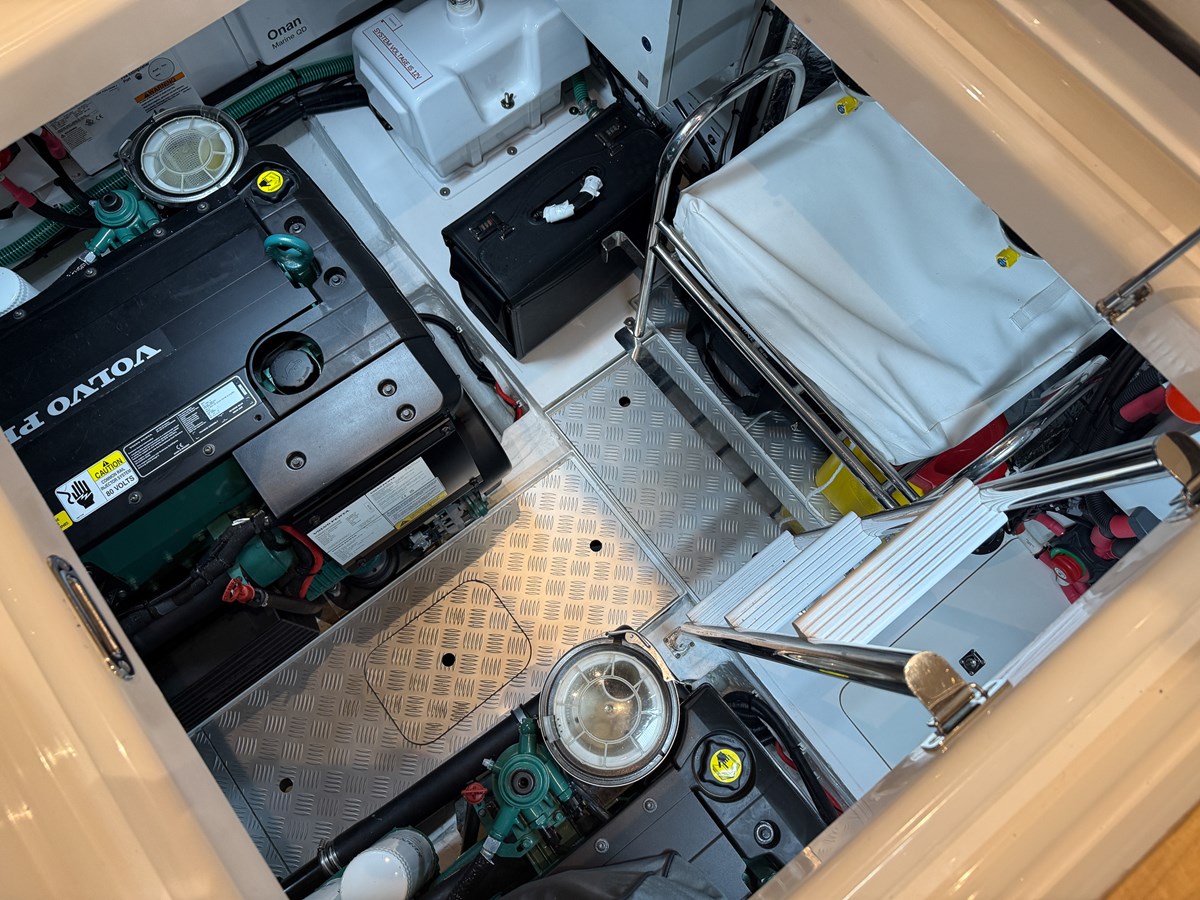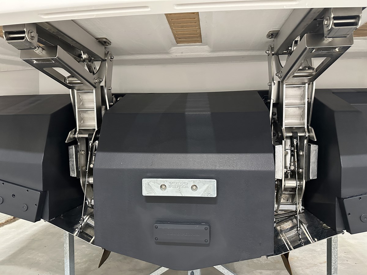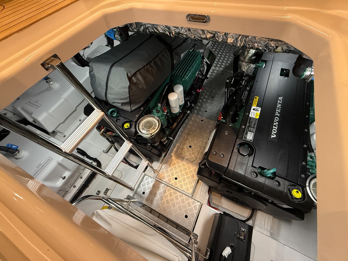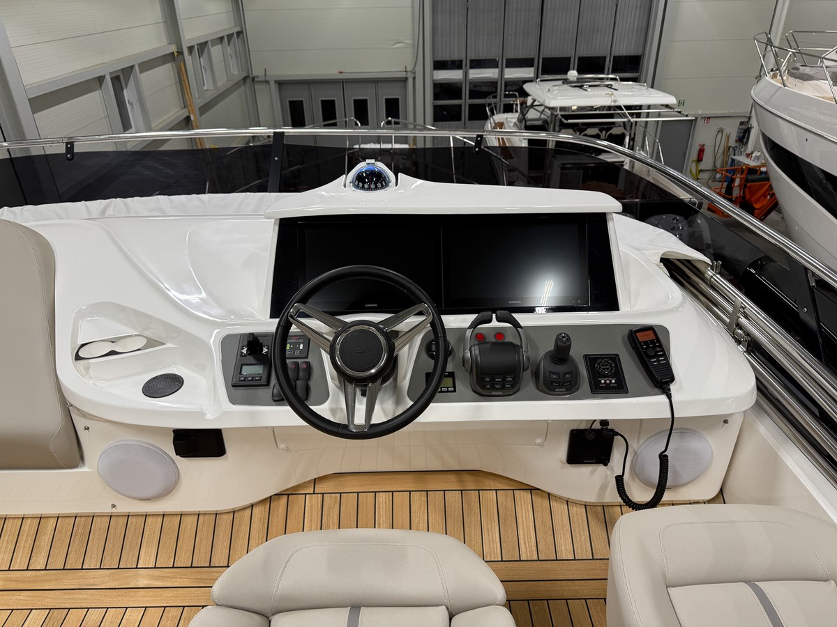 2024 year model • Twin Volvo IPS 650 (2 x 480hp each) diesel engines • Volvo Joystick control • Assisted Docking • Dynamic Positioning System / DPS • Automatic trim system • Variable bowthruster with hold • Hydraulic platform • Walnut interior wood, satin finish • Saloon berth conversion • Heated bathroom floors • Washed/dryer • Dishwasher • Full teak • ONAN generator • BBQ in wetbar • 4x Garmin Glass Cockpit 16 inch chartplotters integrated with Volvo autopilot • Radar • Demist • Heating