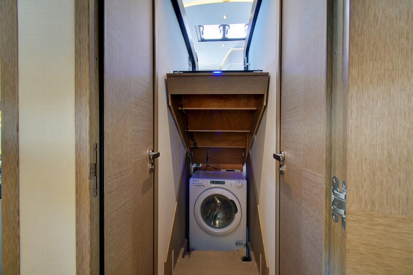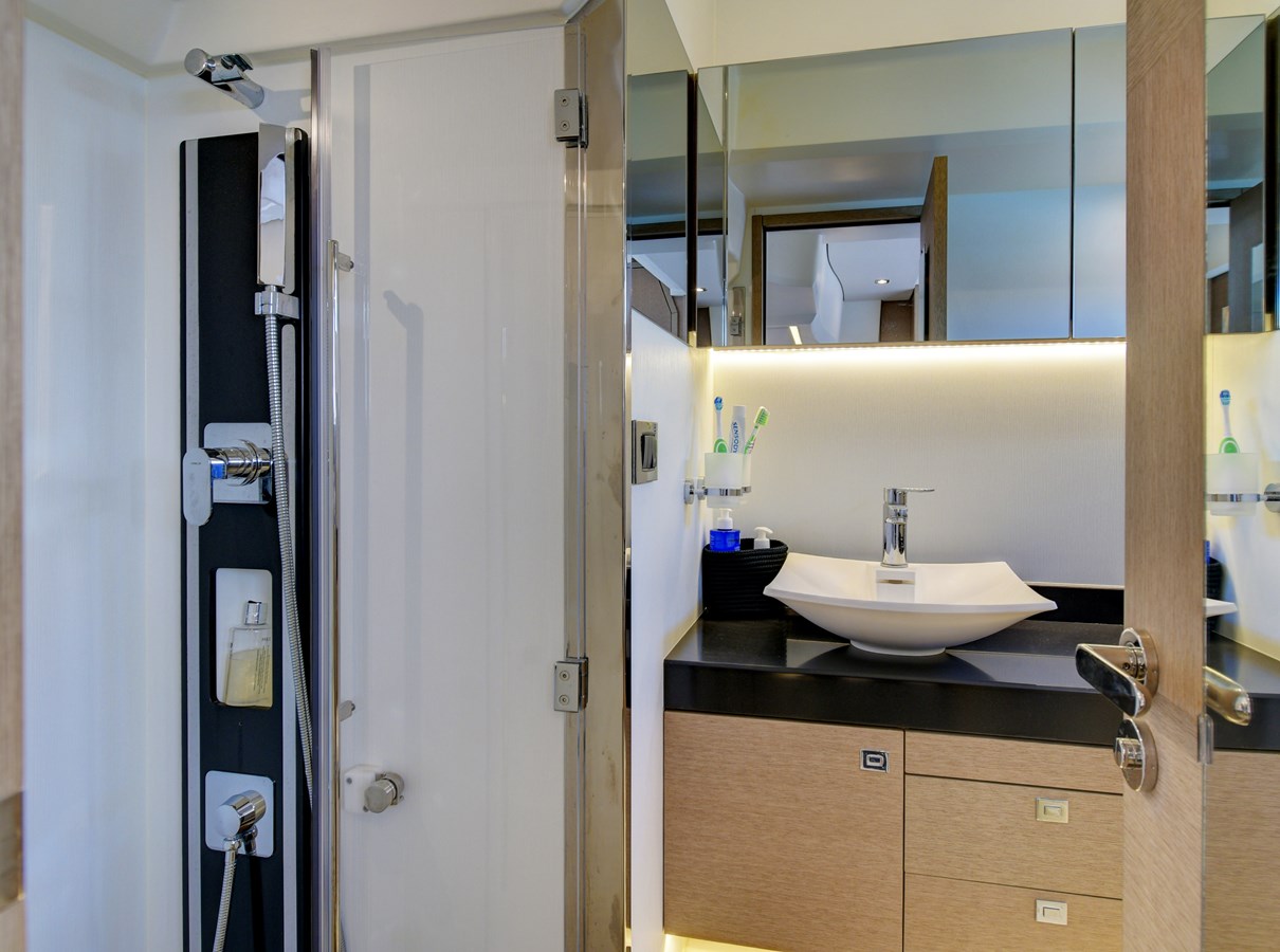 Inside, the yacht offers a seamless flow of space with two distinct yet complementary features. The vast living area is spread across a single level, creating an open and airy environment, while the integrated galley serves both the interior and exterior, ensuring ease of service. The owner’s suite is an epitome of luxury, bathed in natural light from two expansive panoramic windows, offering both privacy with its independent access and ample space, including a large adjoining head and shower compartment.