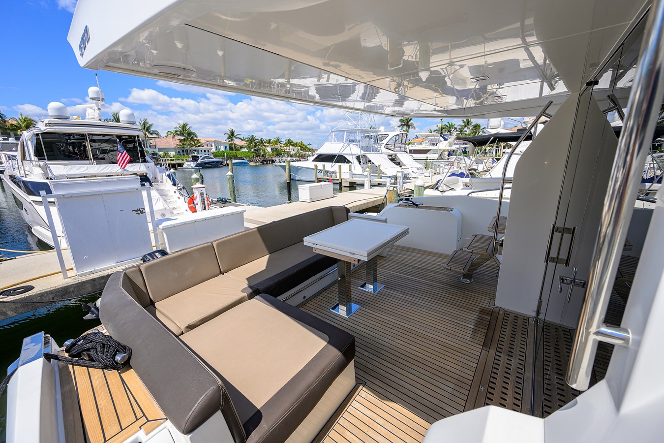 One of the standout features on AT EASE , is her spacious outdoor area located atop the vessel that offers panoramic views of the surrounding seascape. Equipped with comfortable seating, a wet bar, and optional amenities, the flybridge is the ideal spot for enjoying cocktails at sunset or soaking up the sun during the day.