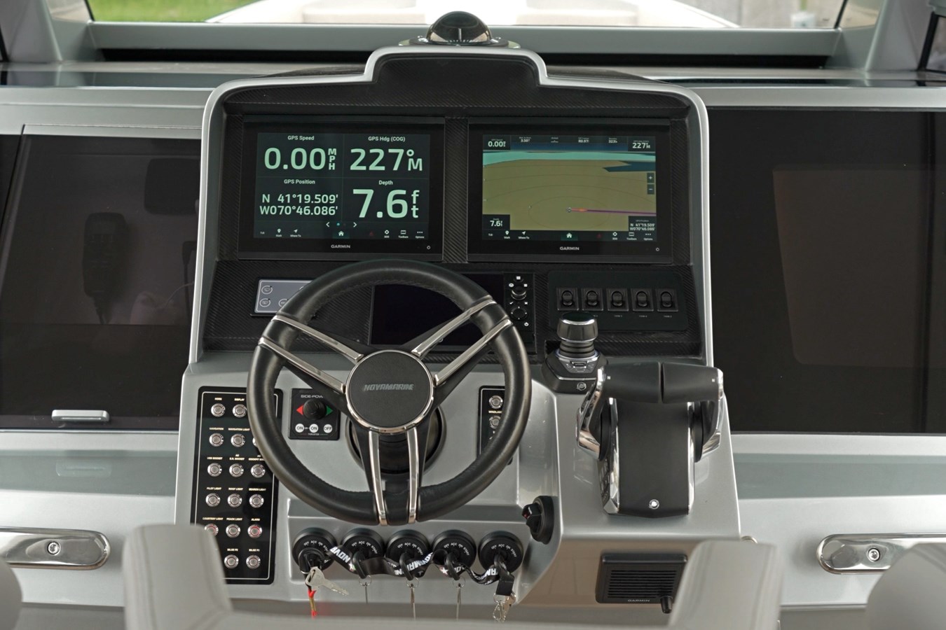 At the helm, Carbon Fiber Panels house advanced electronics, including a Mercury Vessel View 9" screen integrated with twin Garmins, autopilot, radar, joystick with Sky Hook, bow thruster, and single push-button start for all engines. These features ensure confident handling for captains of any experience level.