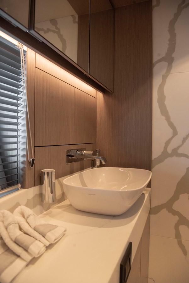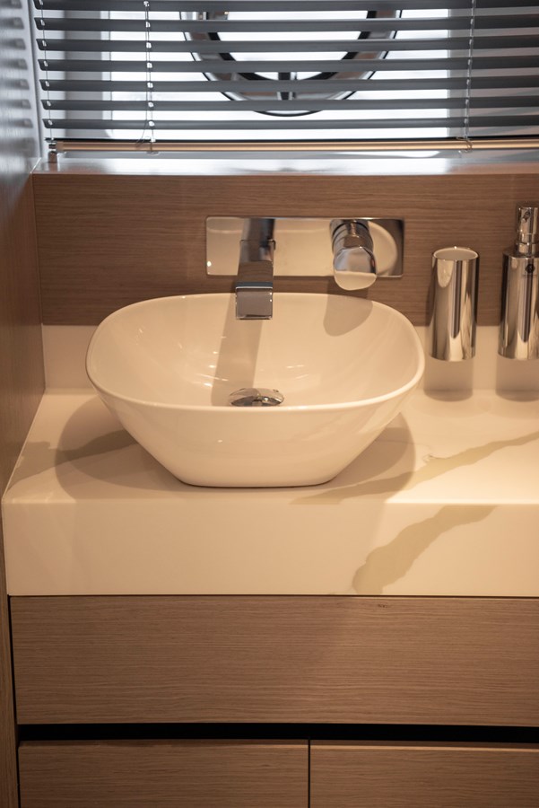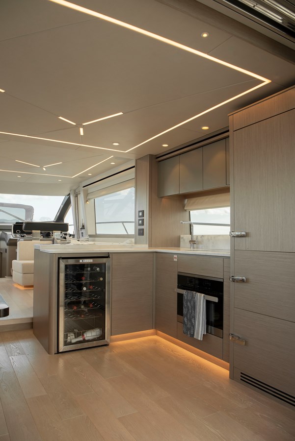 Her “Pacific Edition” layout includes a luxurious grand master stateroom with private lounge area, a custom smoked eucalyptus desk, and opposing saloon sofas with an integrated pop-up TV. A fully equipped upper galley features upgraded Miele appliances, a Vitrifrigo DW360 refrigerator, and a 33-bottle wine cooler .
