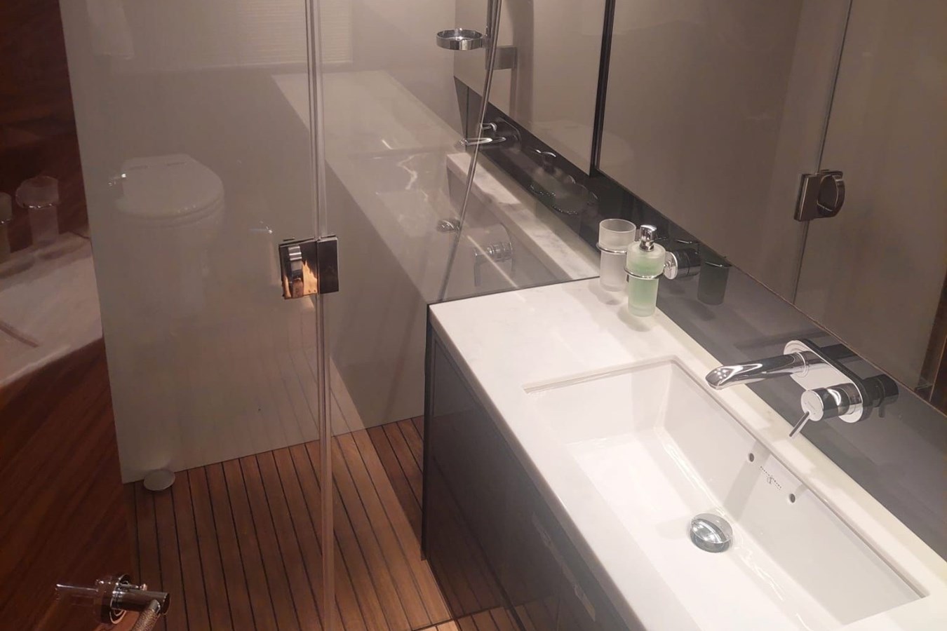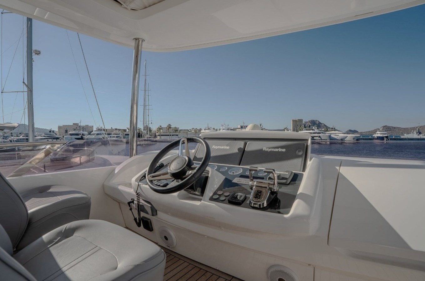 Inside, the Princess 68 offers a bright, open-plan saloon with panoramic windows, a fully equipped galley, and four ensuite cabins for eight guests, including a spacious full-beam master suite. Crew accommodation aft for two.