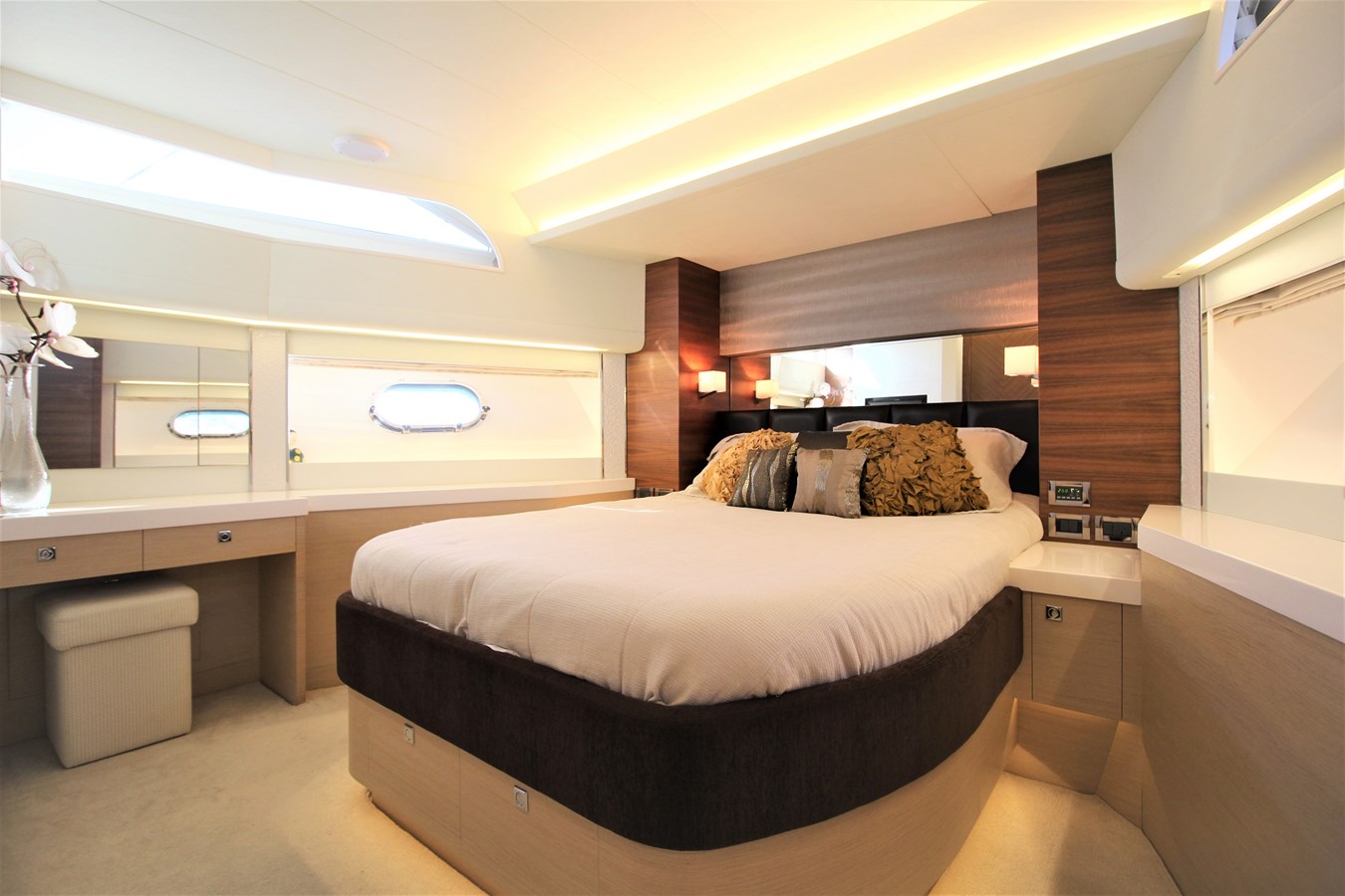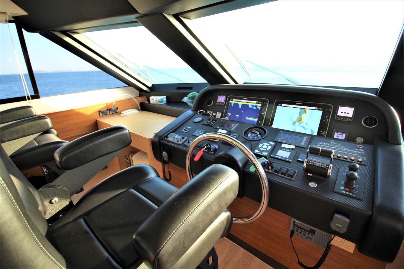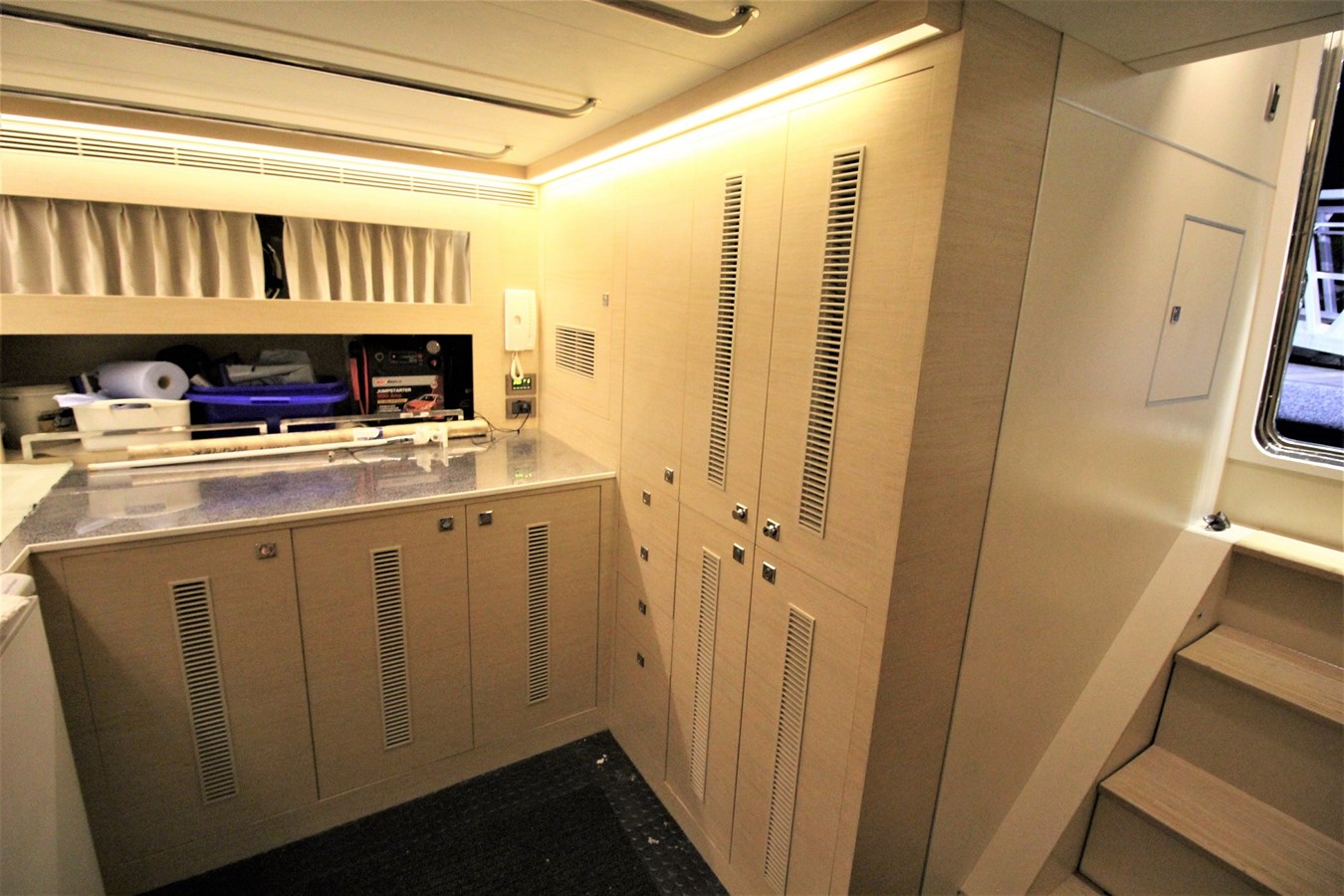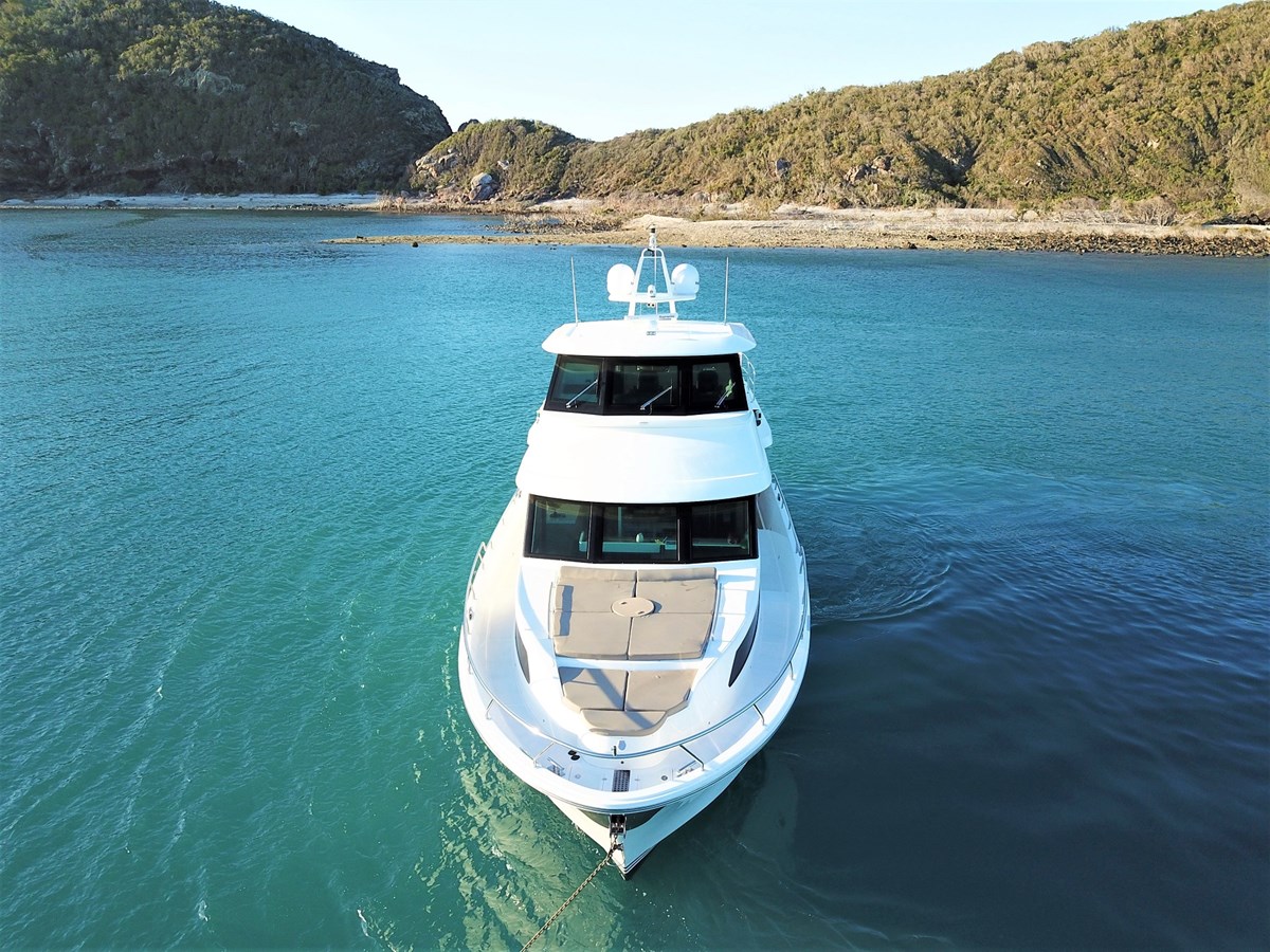 This Horizon V74 is the ultimate owner operated vessel & also boasts exceptional sound insulation so that, while running at cruise, the slight, distant hum of engine power even in the owner's full-beam stateroom, adds to the impression of voyaging, without excessive noise or vibration. At anchor, this feature is emphasised immensely, where no water (Hull slapping noise) will ever torment those light sleepers.