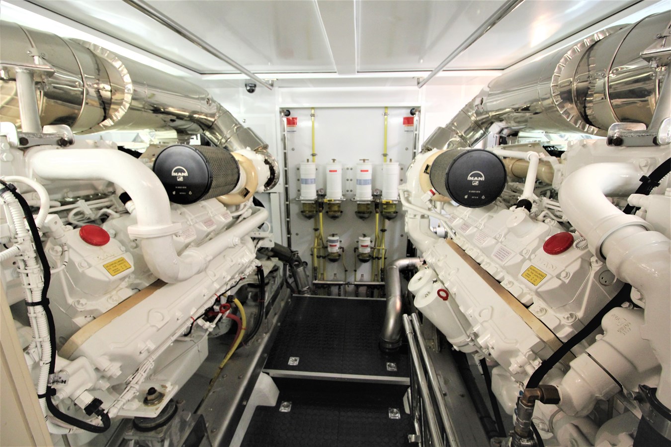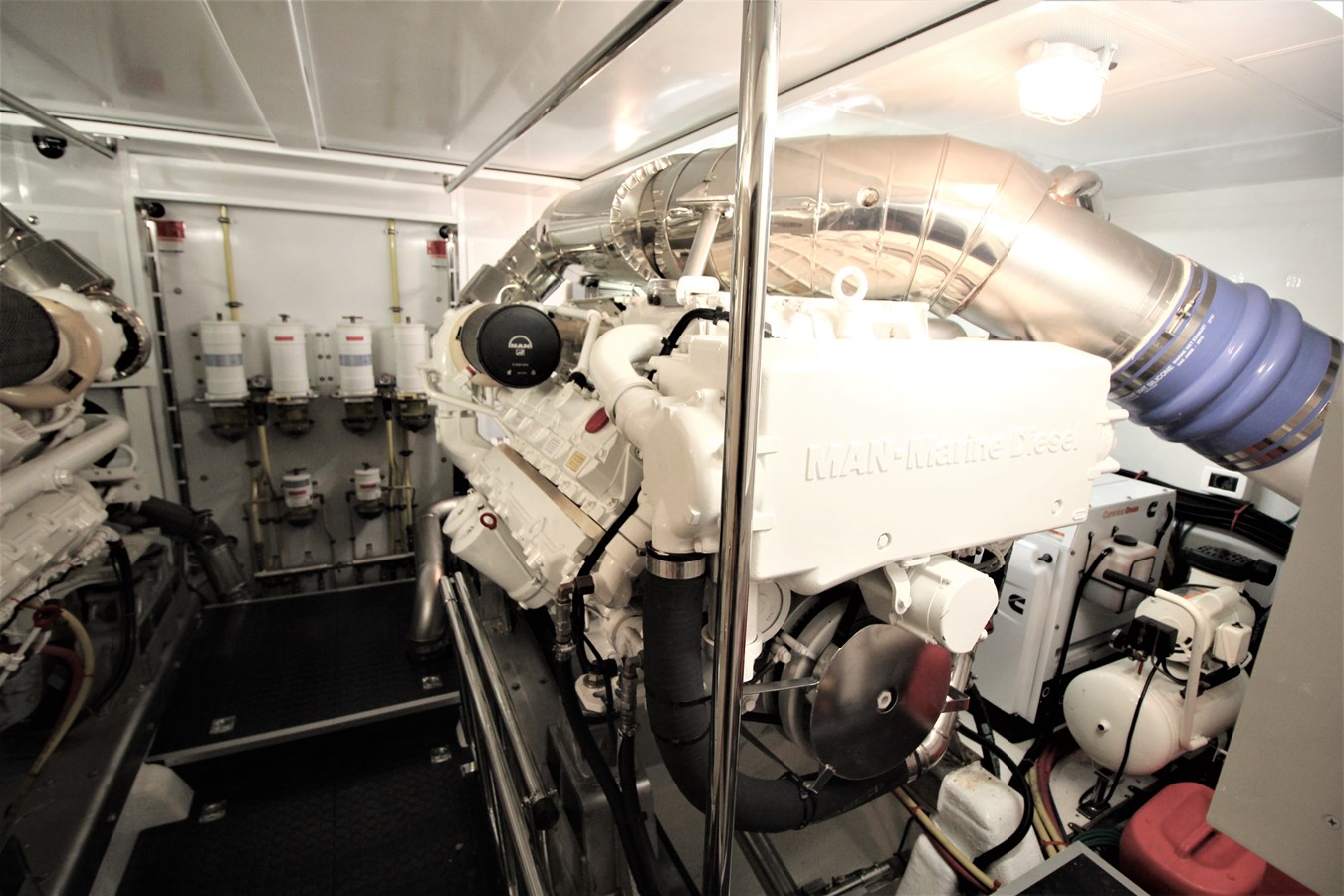 This immaculate V74 boasts huge volume having a semi-displacement hull and LOA of 73' 8" and a wide beam of 20' 6". She is powered by dual 1,100HP MAN V10 shaft drive diesels offering excellent economy and sprint performance. Combining Greg Marshall's super-efficient hull design technology and a 5,754 litre fuel capacity makes this vessel capable of long range, high speed, blue water cruising.