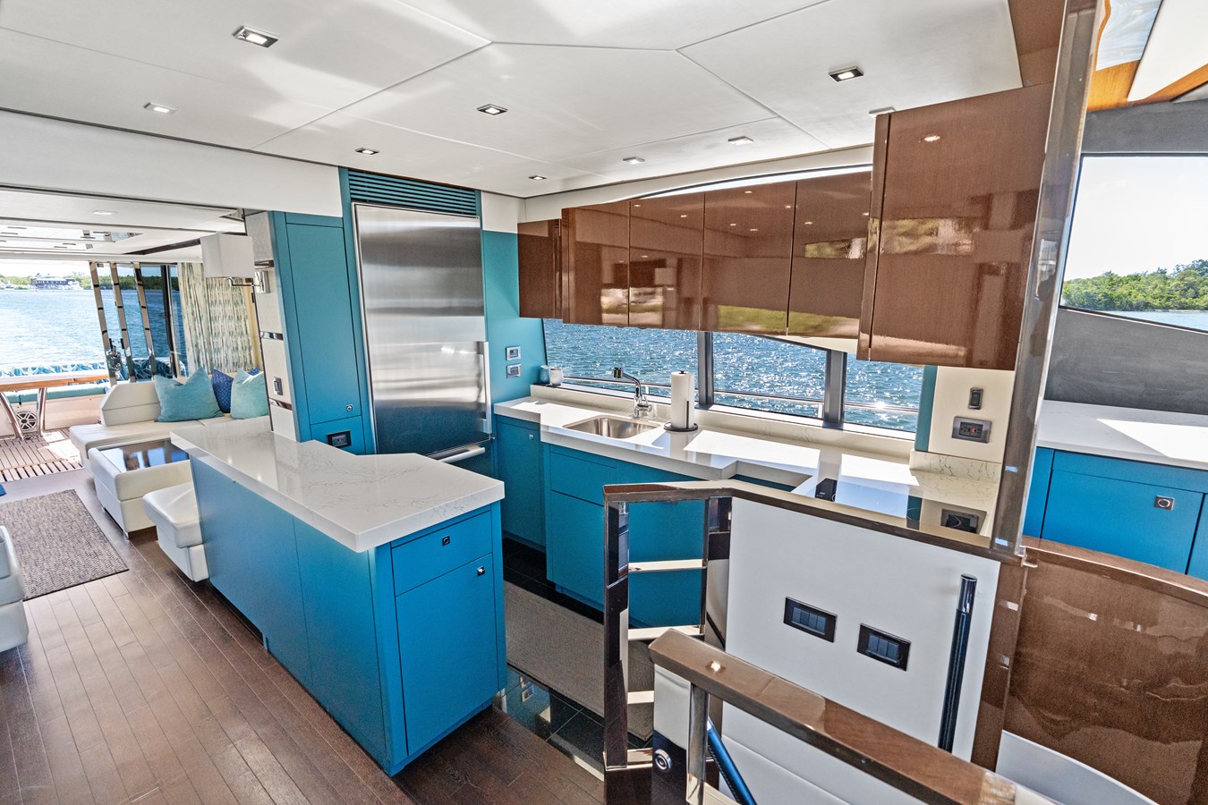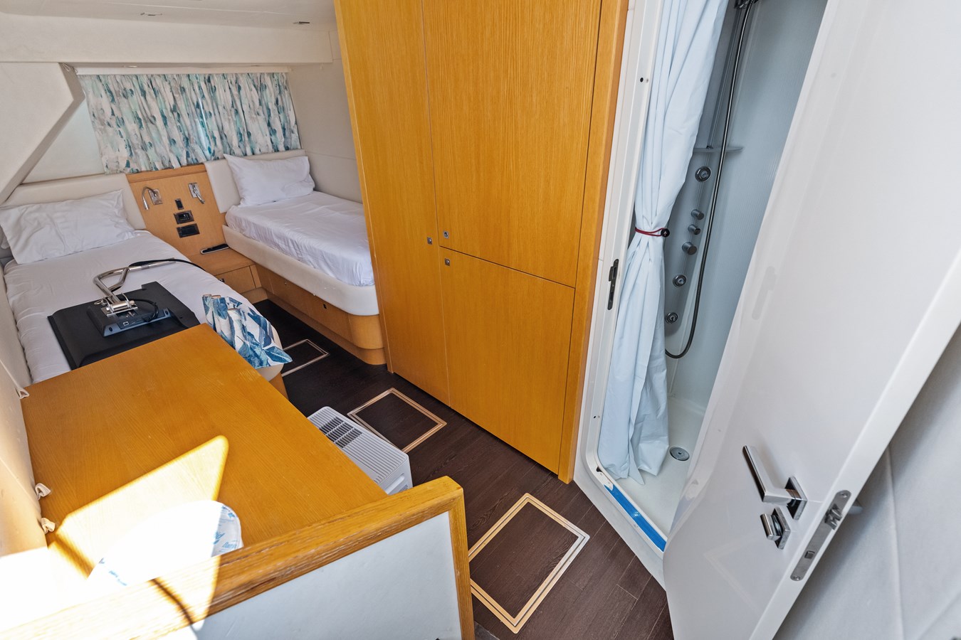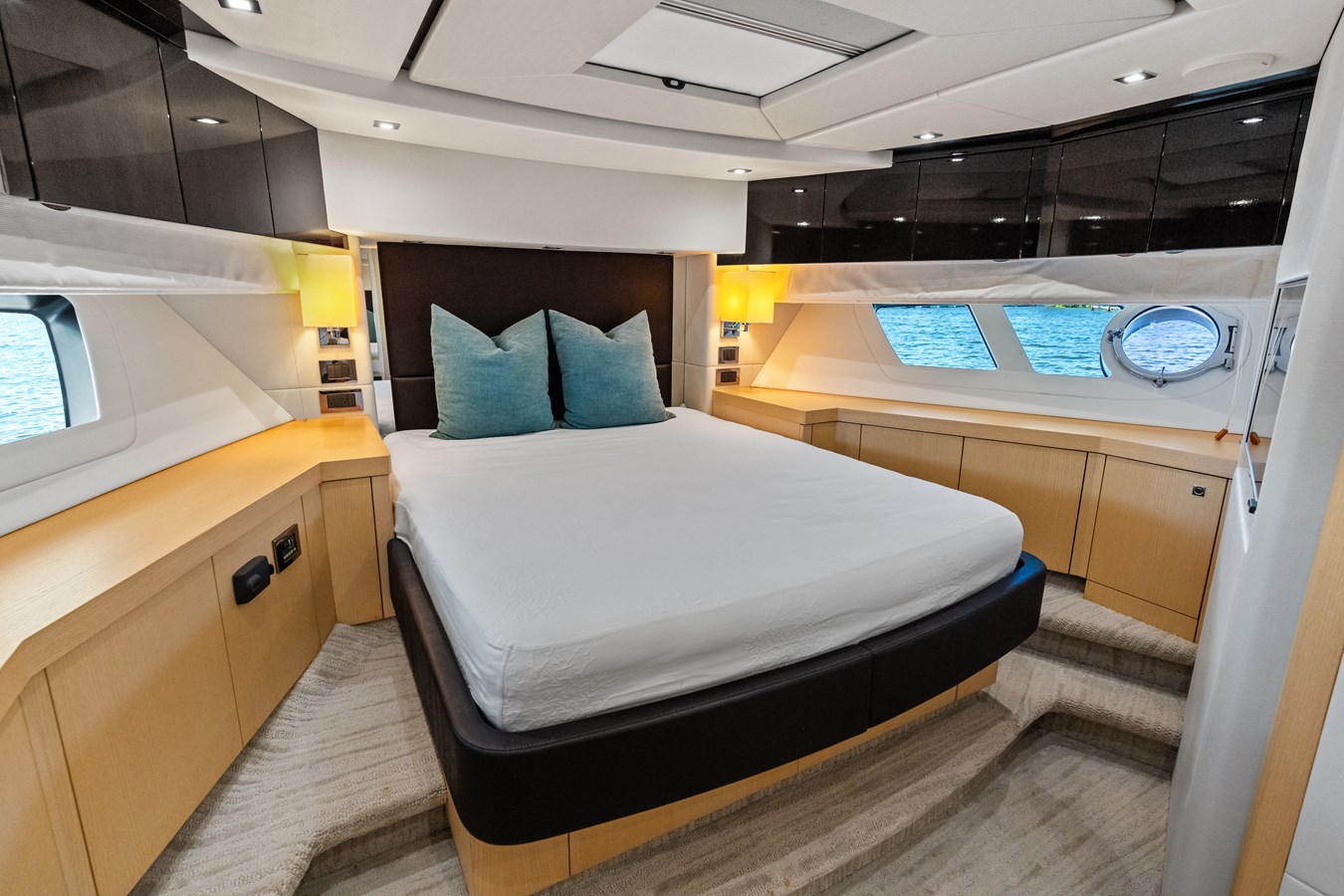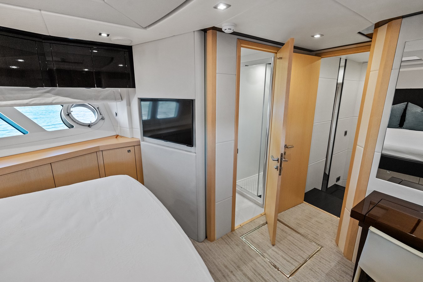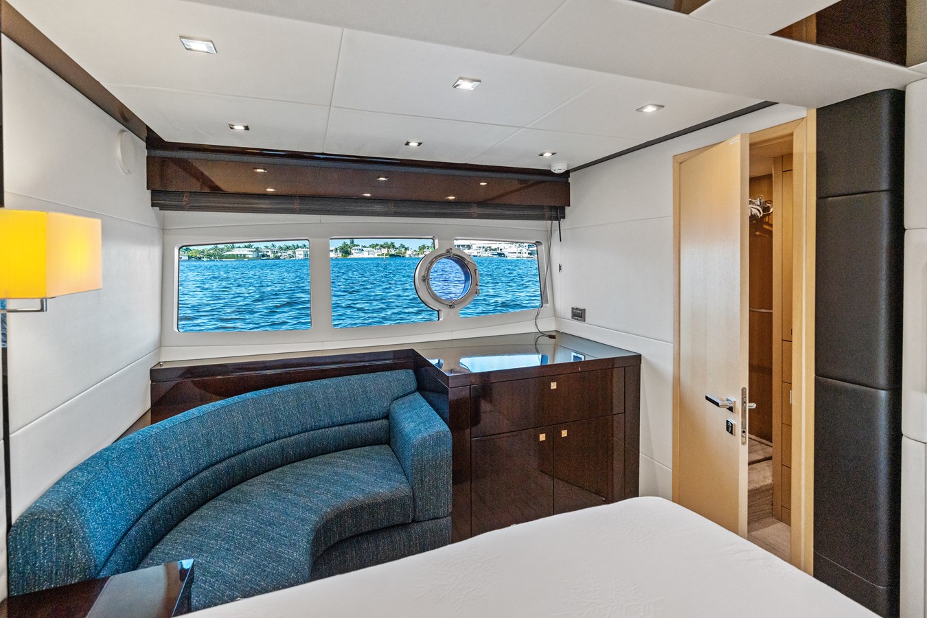 At the stern, you'll find a comfortable stateroom equipped to host two crew members. The spacious Interior is enhanced by large hull-side windows, allowing natural light to flood the modern-styled living spaces. All new Quartz counters in Galley with full-size refrigerator. Below deck, the Sunseeker Manhattan 73 boasts a full-beam master stateroom with large windows, a desk, and a couch. This large stateroom includes a walk-in closet and a luxuriously finished bathroom with new Quartz counters and shower feature. Moving forward, the vessel accommodates a twin cabin on the port side and a spacious storage room. Mid-ship on the starboard side, there is a guest cabin with a floating queen and a bathroom that also serves as the day head, accessible from the hallway. At the forefront is the VIP cabin with its own bathroom and a floating queen bed, illuminated by plenty of natural light streaming through the large windows in all cabins.