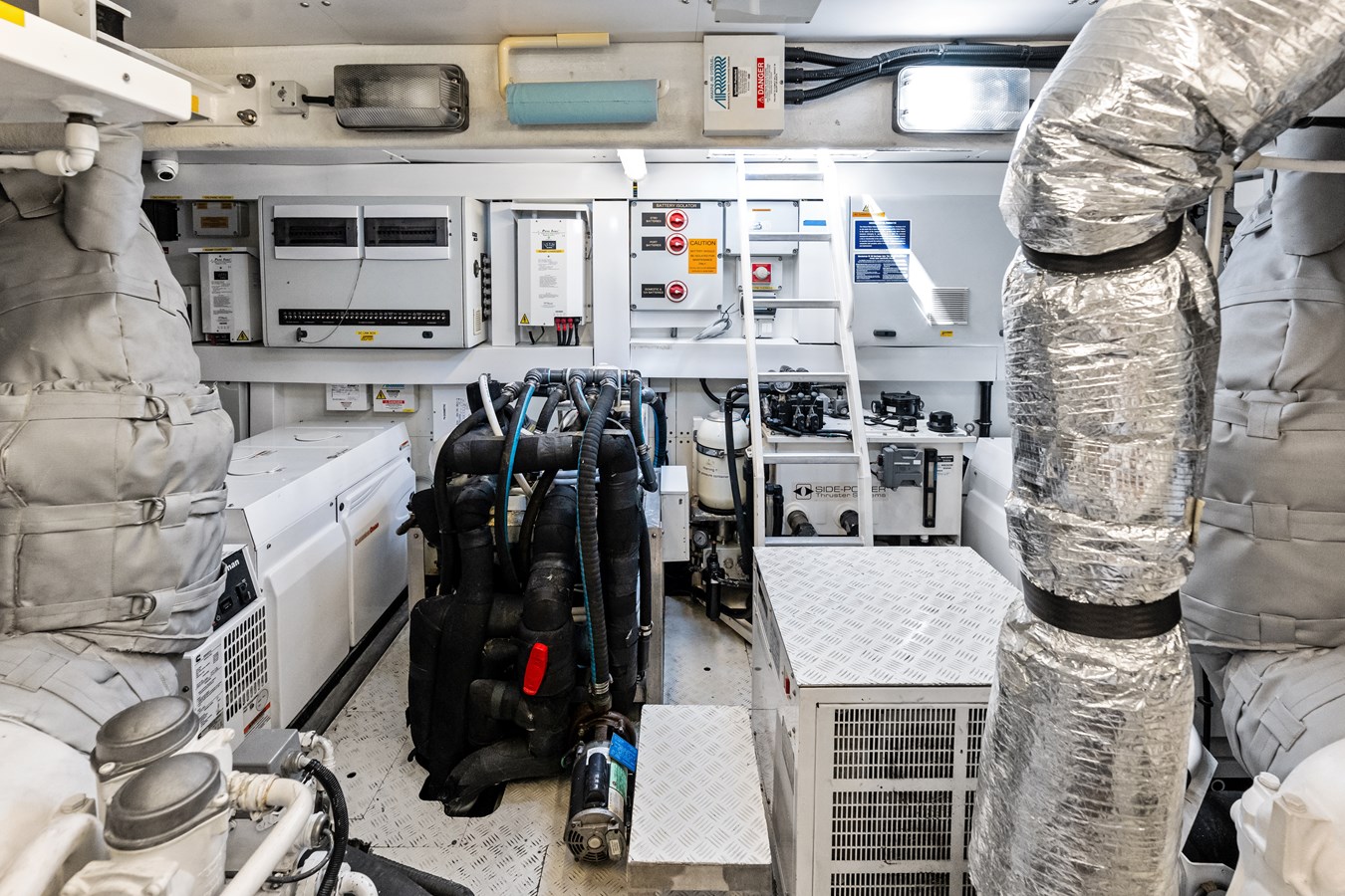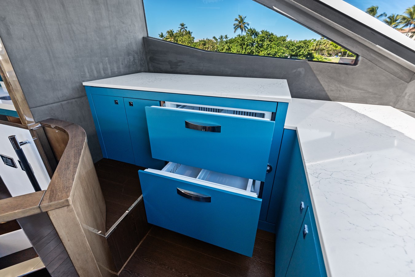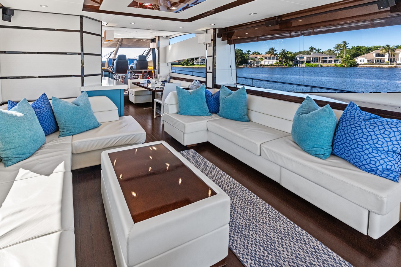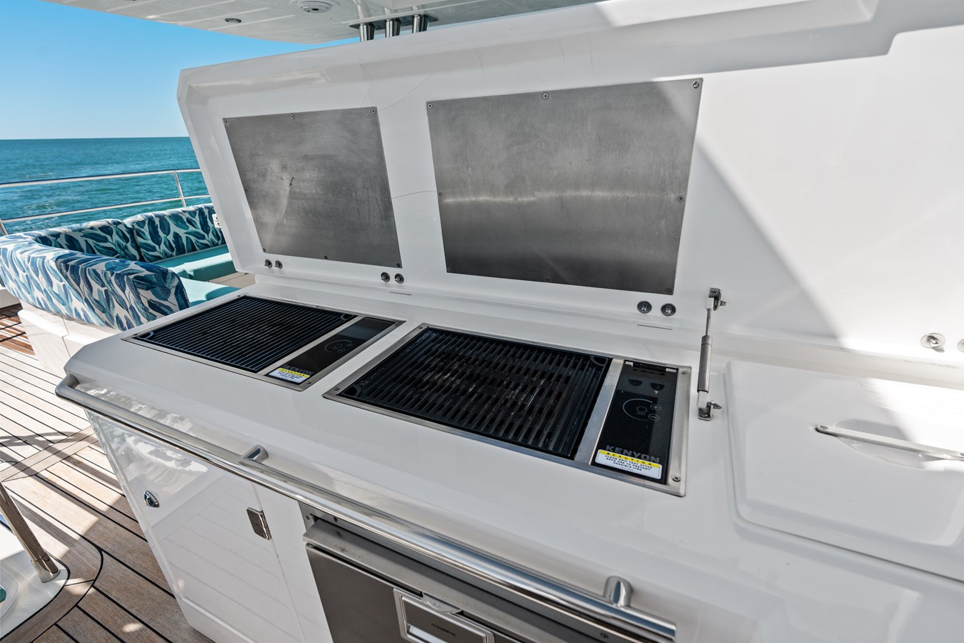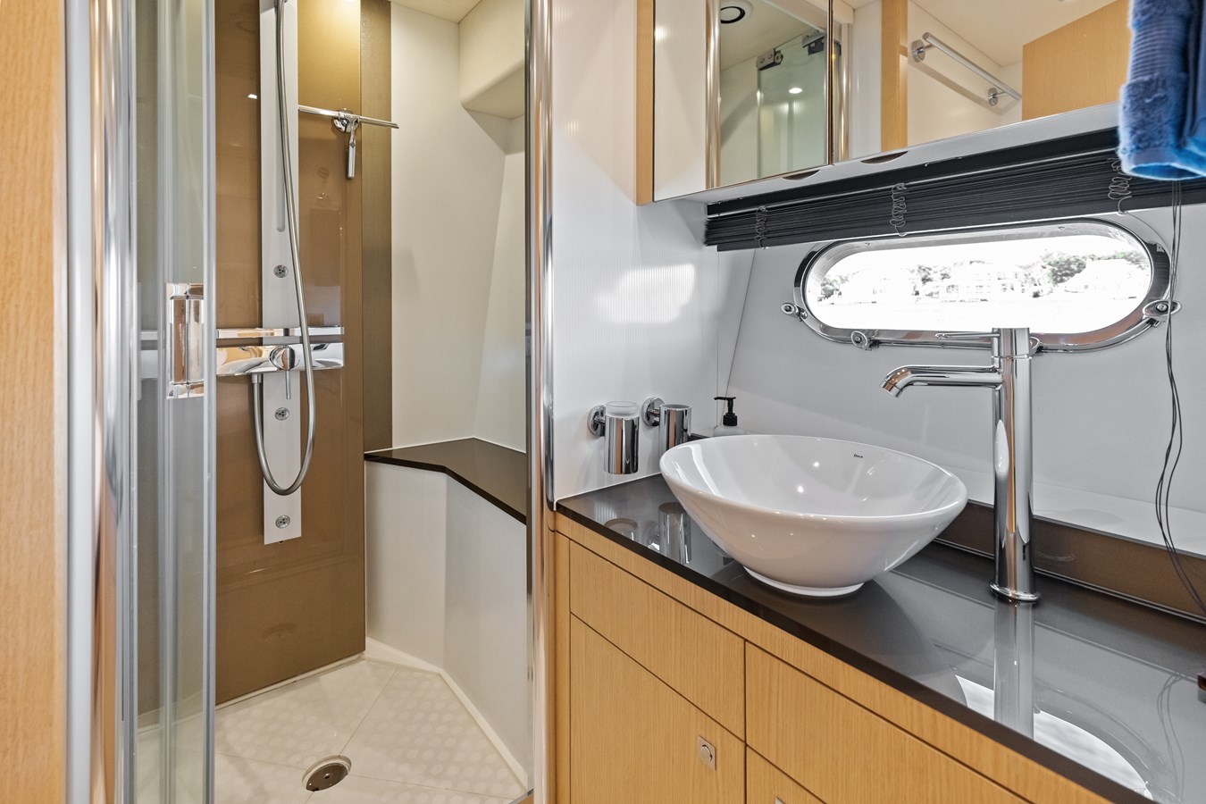 Every detail is finished as expected from a premium brand like Sunseeker, in a modern and stylish manner. The expansive sundeck (with enclosures) is the perfect spot to soak up the sun, unwind in style, and enjoy panoramic views of the open ocean. The large bow offers comfortable and spacious seating for a private retreat, ensuring a tranquil escape for those seeking a more intimate atmosphere. The aft deck invites you to savor the fresh sea breeze, creating the ideal setting for intimate dining, gatherings, or quiet moments of contemplation.