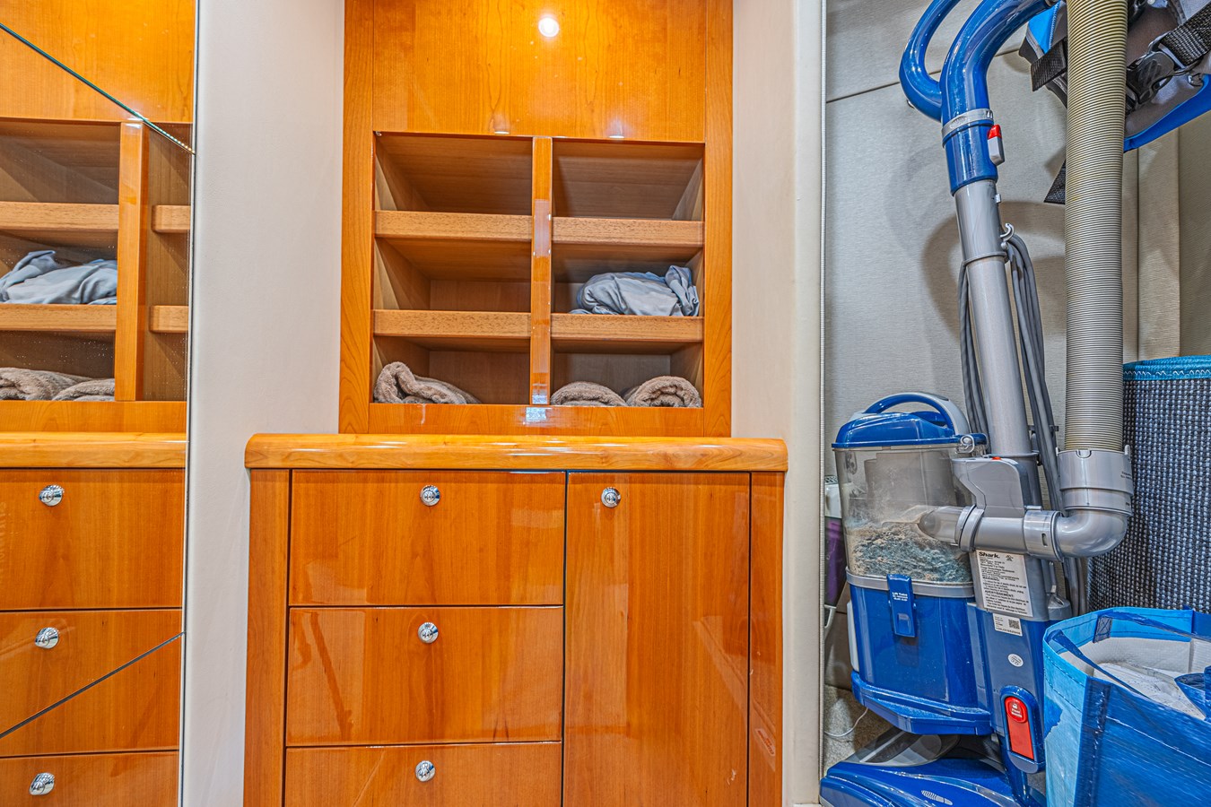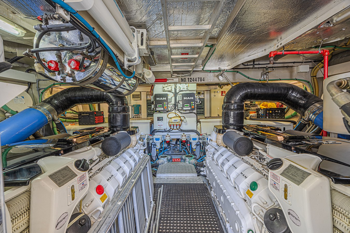 Powered by NEW 2016 MAN V12 engines , she delivers reliability with the peace of mind of a newer power package. You’ll find twin generators , including an upgraded 23 kW unit with only 460 hours and the original 23 kW with just 2,124 hours . A 60-gallon watermaker, oven in galley, 2 Perlick refrigerators, Separate Washer and Dryer, and everything else needed for an easy trip to the Bahamas.