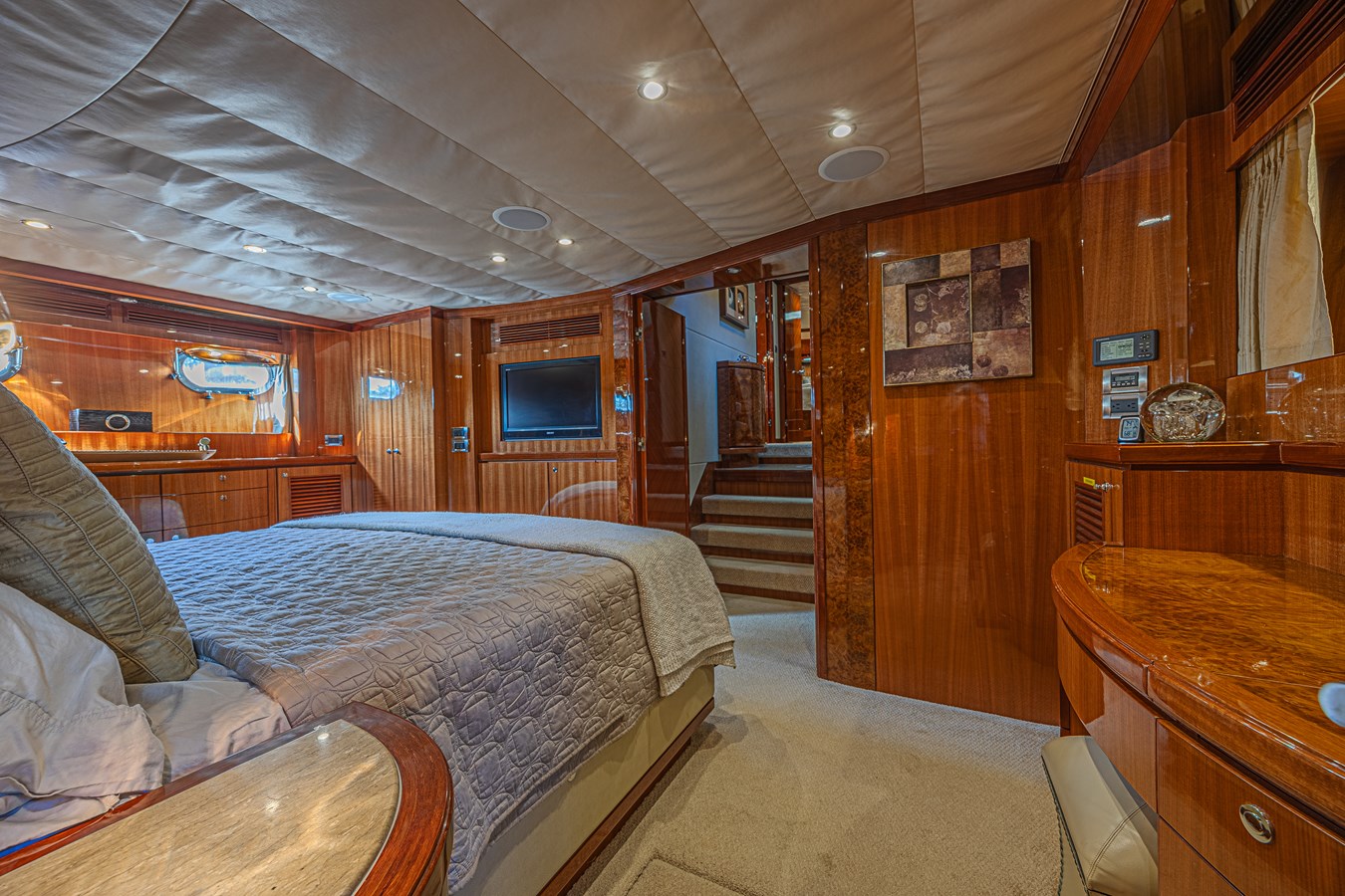 Constructed with a GRP hull and superstructure and finished with elegant teak decks, Margarita delivers both performance and style. She is powered by twin MTU 10V 2000 M94 diesel engines producing 1,500 hp each, allowing her to cruise comfortably at 19 knots and reach a top speed of 24 knots. Freshwater capacity is approximately 350 gallons.