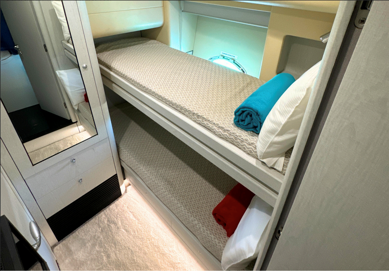 A twin cabin and a bunk cabin sharing an additional bathroom