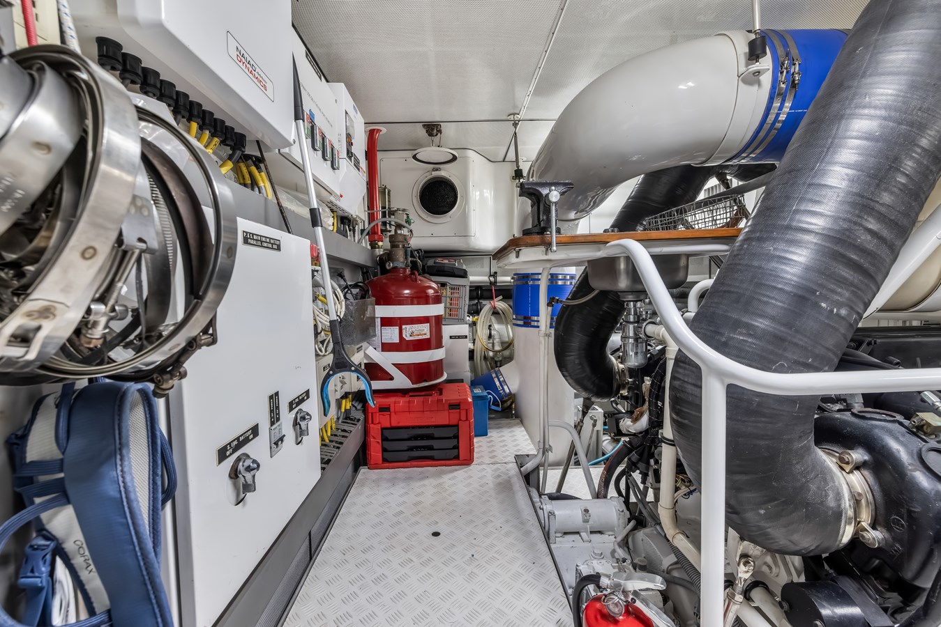 JUS CHILL’N is an impressive 84’ Cheoy Lee Bravo 2012 that has been professionally maintained by captain and crew. She is a must-see vessel in this size/price range due to many unique features like a country kitchen, spacious factory-built cockpit with stowed davit, a TNT lift, wide walkaround side decks, a high volume interior, air-conditioned flybridge with enclosure, and great performance with a 20kt cruise. The vessel features a three-stateroom layout with two full-beam king berths and one VIP queen berth. The crew quarters are located aft with two staterooms and a crew lounge.
