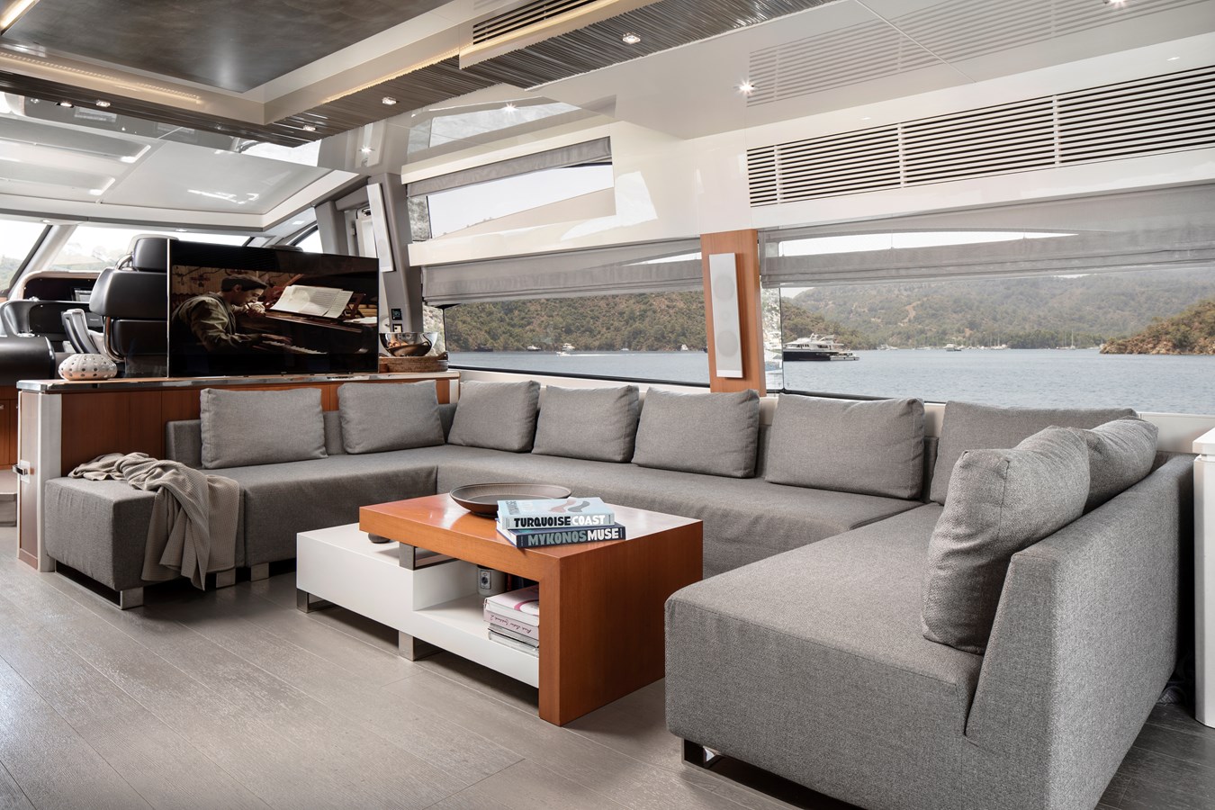 Sitting beneath the vast sliding hardtop roof is the main saloon and cockpit. When opened, natural light illuminates the interior allowing guests to indulge in the lavish surroundings.