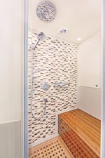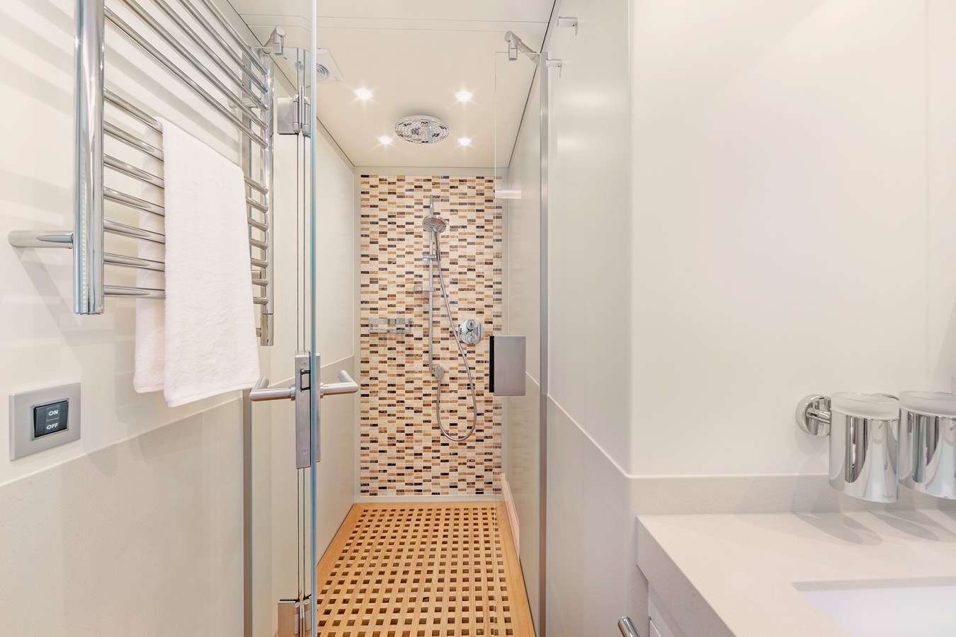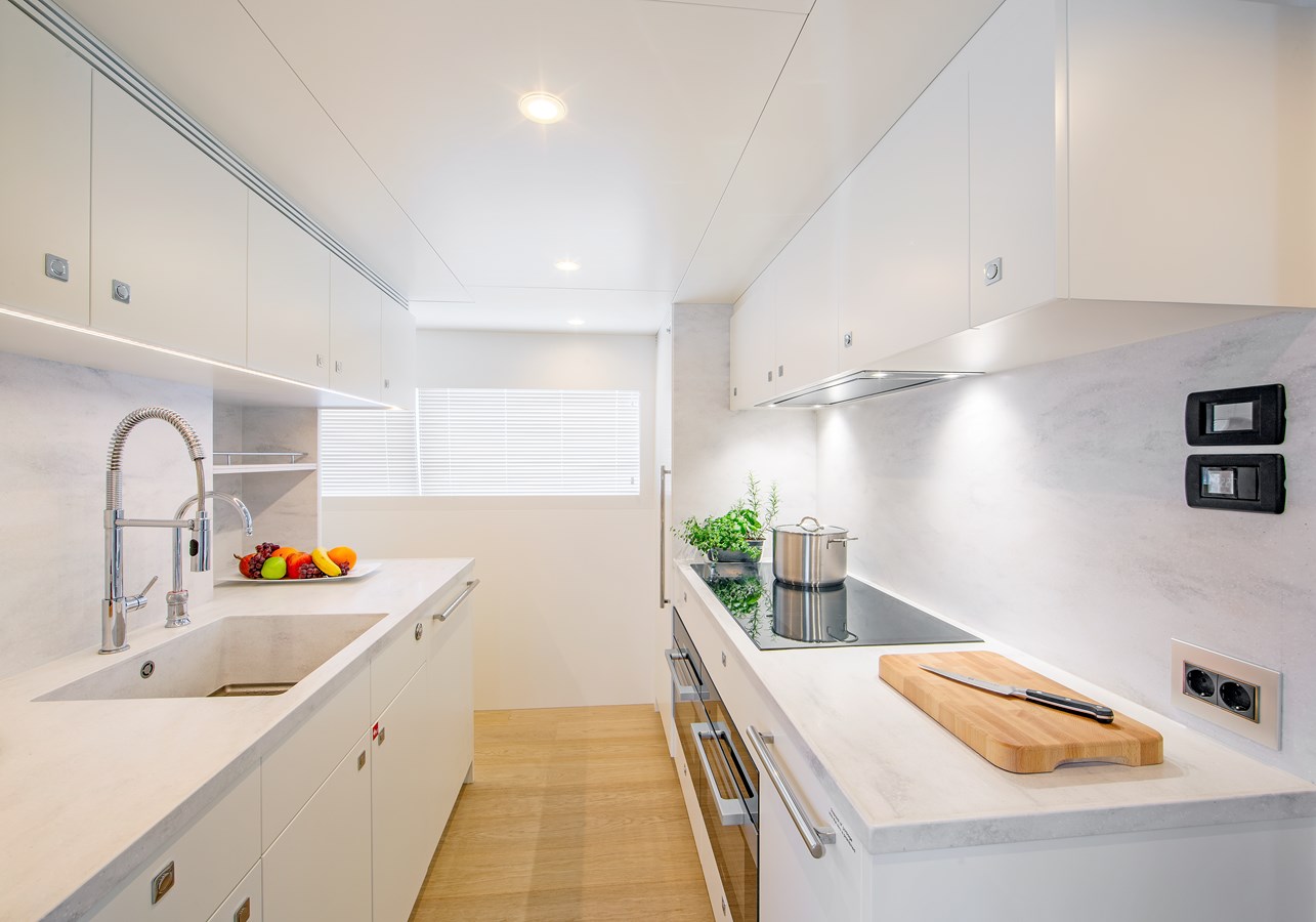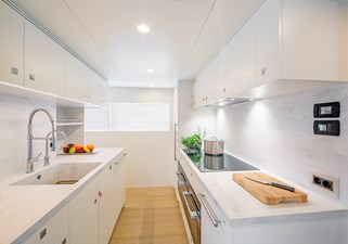 Accommodation on board is for a total of 8 guests split across four staterooms, while the crew accommodation is for three in the forepeak. Elsewhere, the outdoor areas feature a helm station, large tender and lots of sun beds, with a hydraulic swimming platform.