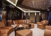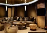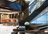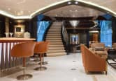 Stepping inside, a four-deck atrium with a central glass lift is the centerpiece of the contemporary interior. The owner’s suite, draped in golds and blacks and intricate marbles, boasts his and hers bathrooms with a private jacuzzi, generous wardrobes, private helipad access, and an office space. Additional accommodation is found in the six remaining staterooms, including two VIP suites, where the lavish style ranges from Japanese design to Art Deco flair. A WHISPER yacht charter offers three full lounging and dining areas, including formal dining for 18 guests; a decadently luxurious full-service spa; two retractable sea terraces that open from the lobby and gym spaces; a vastly spacious double-height main saloon; and a cozily intimate cinema room.