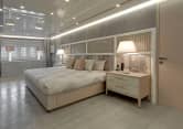The commodious full beam master suite features an impressive ceiling height of 2.35 metres, providing the area with an extremely spacious feel that is made welcoming by the homely polished wood floors and warm, neutral colour scheme. This room contains His & Hers closets and a separate dressing area, allowing guests both space and privacy on board. The ensuite bathroom is particularly opulent, with a large bathtub and rainfall aromatherapy shower.