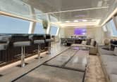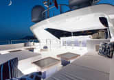 On the main deck forward, a Jacuzzi surrounded by large Nikki Beach-style sunpads on 3 sides creates a relaxed atmosphere well suited to sunbathing, relaxing and making the most of the sun. Another two back-to back pop-up TV’s are also found in this area, as well as a third separate dining area for up to eight guests. Optional awnings mean that guests can either choose to experience their al fresco dining in the shade or, at night time, enjoy the experience of a unobstructed nightsky view. The foredeck features an extra large sunpad area for sunbathing and relaxing, adding yet another area for guests to enjoy company or find privacy. Concluding the exceptional outdoor areas is a stylish flybridge with a classy bar area and trendy modular seating with large center chaise. A large BBQ is also featured as well as more optional awning.