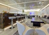 The bespoke yacht’s interior is both tasteful and stylish, and boasts over 250 textures and fine materials, including exquisite stone, valuable woods, mother of pearl & luxurious leathers, which include Aston Martin leather chairs. Adding a unique flair to the sophisticated surroundings, well-appointed artwork can be seen throughout the vessel over all deck.She accommodates up to eight guests over four luxurious cabins, including one master suite, one VIP cabin and two double cabins, all of which are found on the lower deck of the vessel.